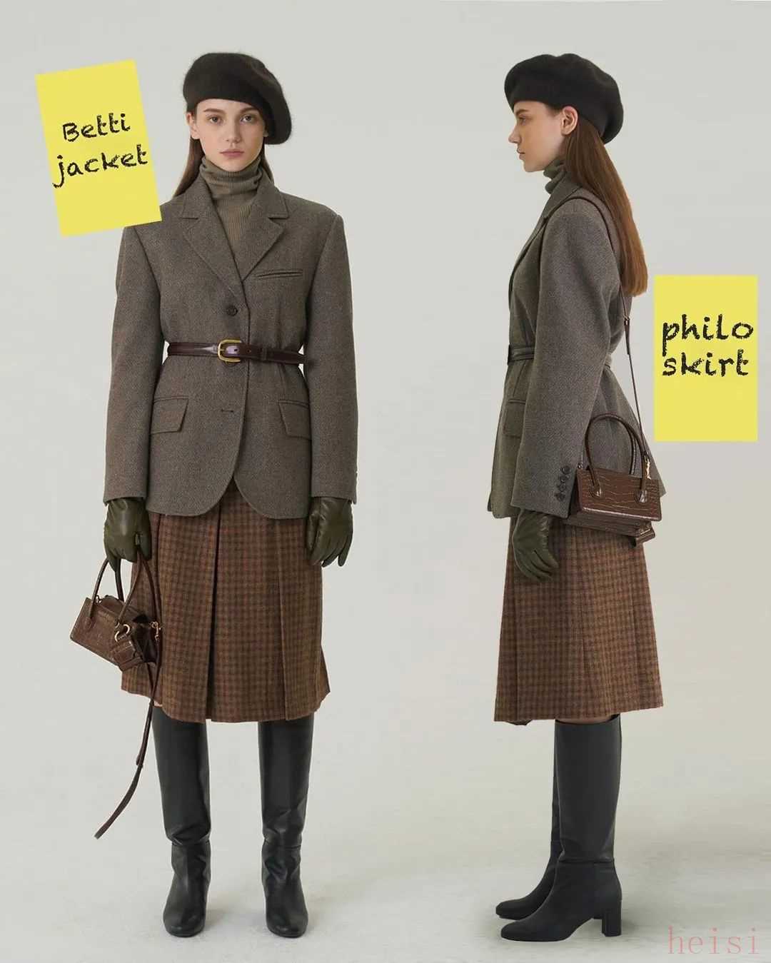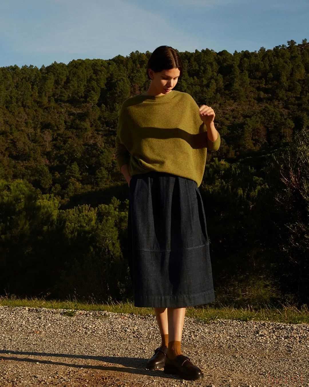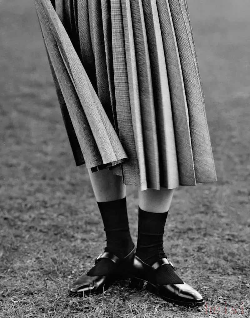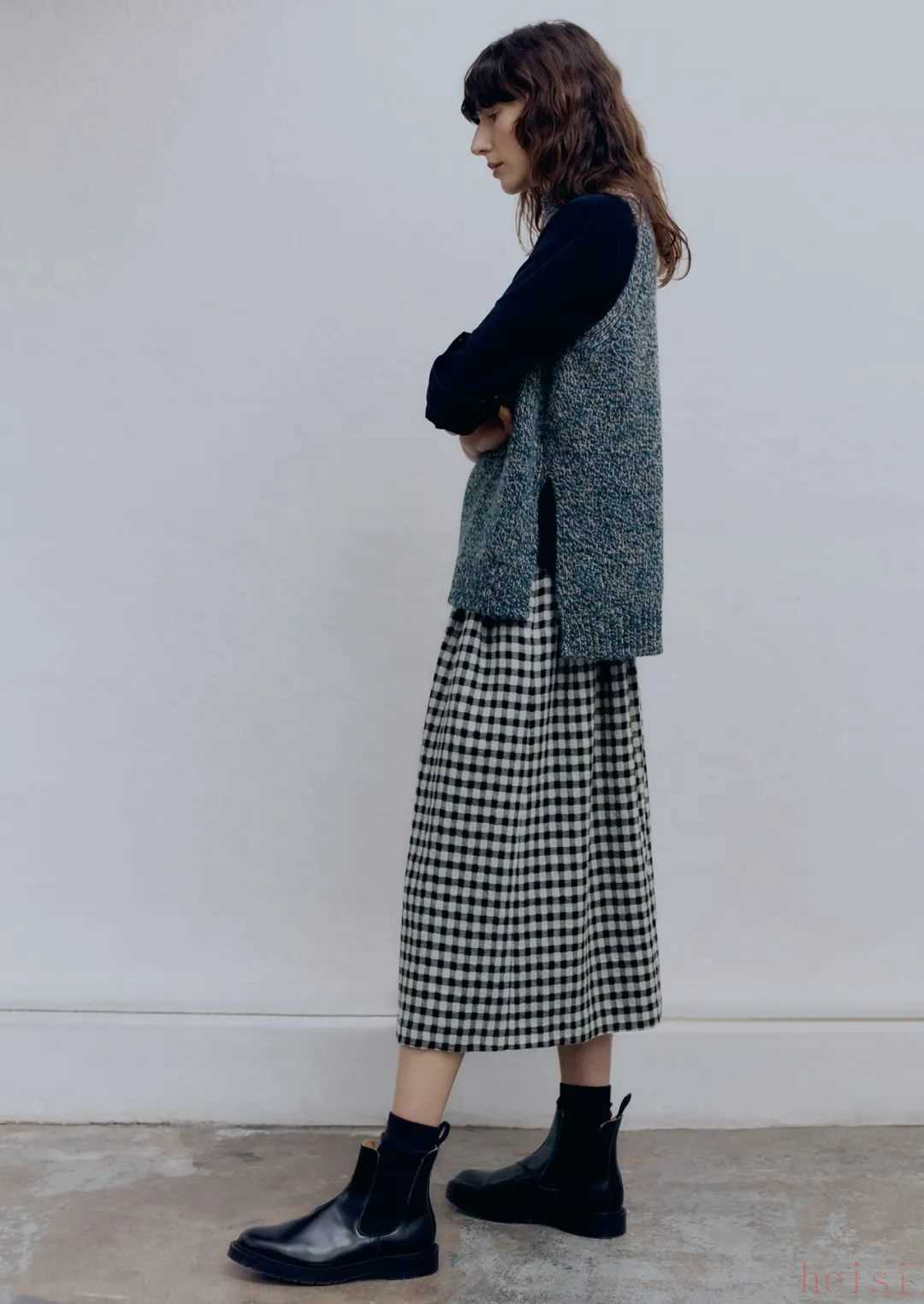 MH也有裙裝,但長(zhǎng)度都是在小腿附近的中長(zhǎng)裙,以百褶裙和壓褶裙這類文藝感比較強(qiáng)的裙子為主。再加上長(zhǎng)襪和小皮鞋,英倫氣息就上來(lái)了。▼