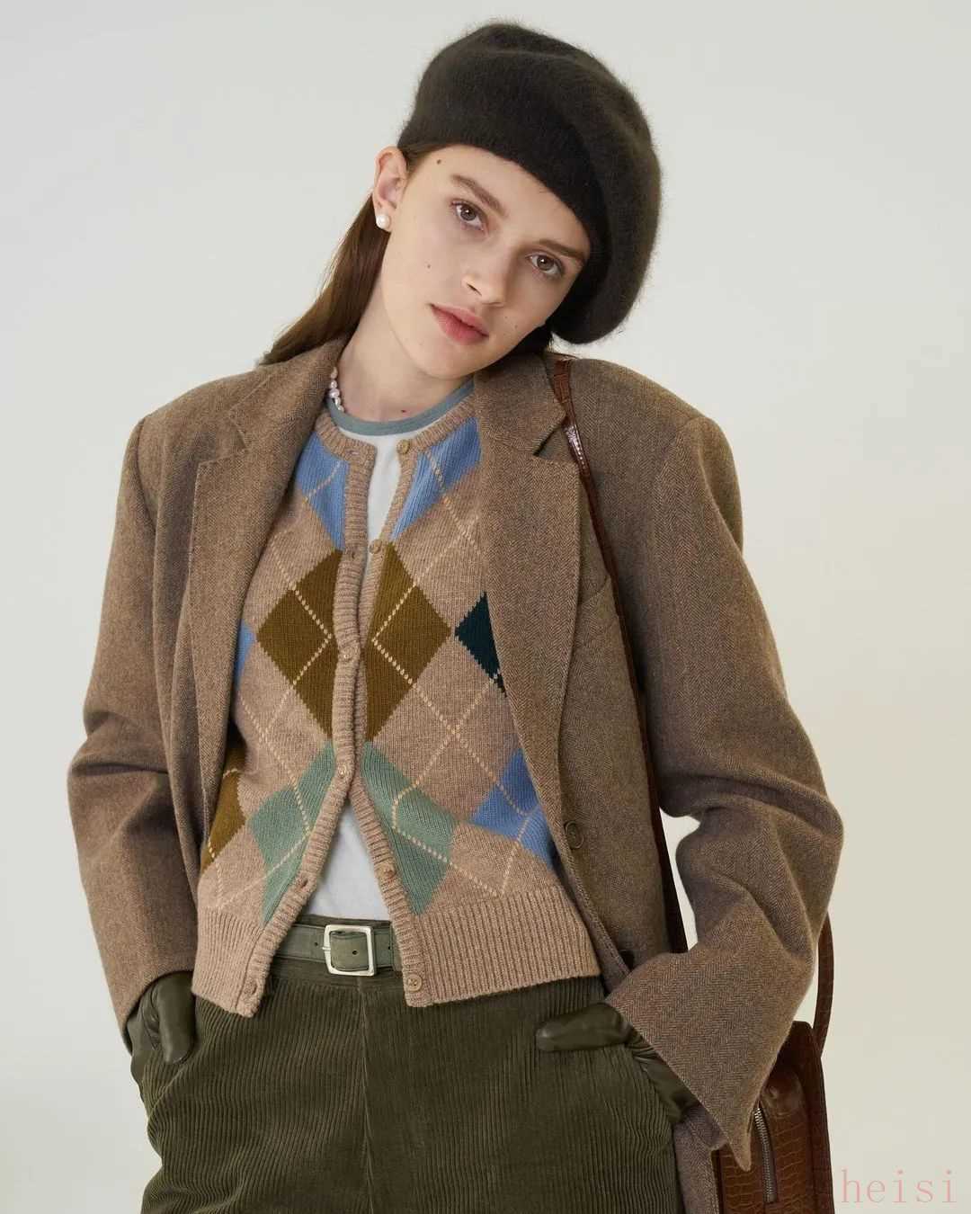 菱格紋開衫以前說(shuō)過(guò),選不對(duì)款還蠻容易顯老氣的,但這件加入了亮色色塊,變得有活力多了。做內(nèi)搭時(shí)還能打破整體造型的沉悶。