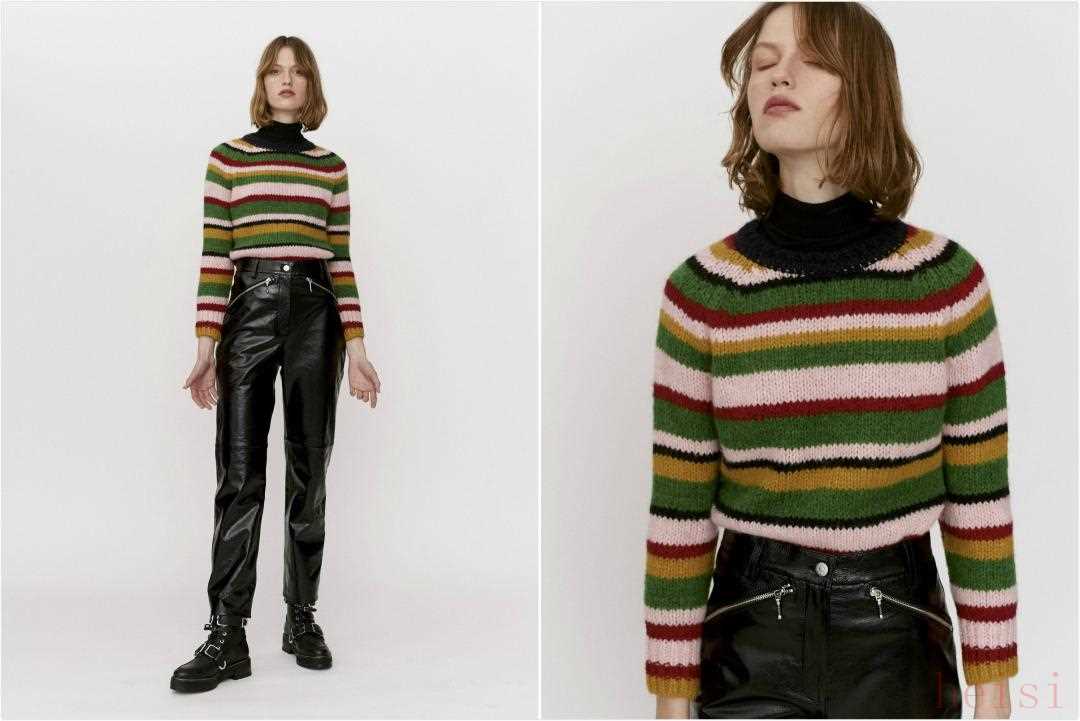 這件條紋毛衣配色也蠻特別,雖然看著挺花,但也不難駕馭,學(xué)模特搭配一條黑色皮褲,又帥又復(fù)古。它其實(shí)是一件圓領(lǐng)毛衣哦,里面內(nèi)搭了黑色小高領(lǐng)。國(guó)外官網(wǎng)約763元。▼