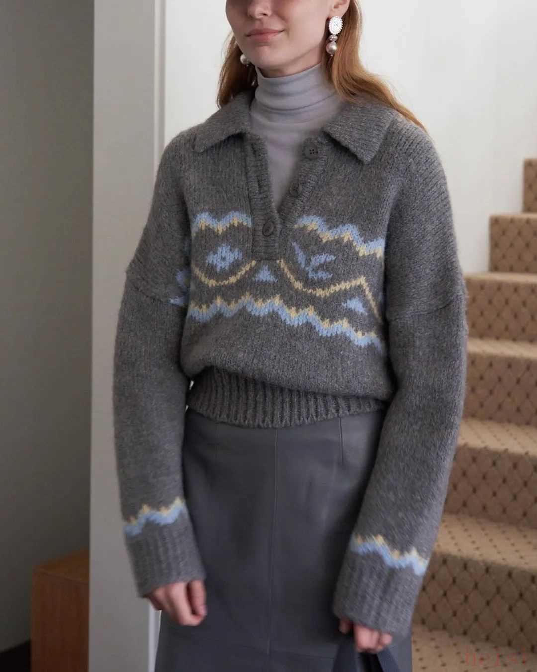 這件Polo領(lǐng)毛衣是他家熱門單品,我也挺心動(dòng)的。簡(jiǎn)單的費(fèi)爾島圖案加入進(jìn)今年大熱的翻領(lǐng)元素,辨識(shí)度還挺高,單穿疊搭都可以。海淘約760元。▼