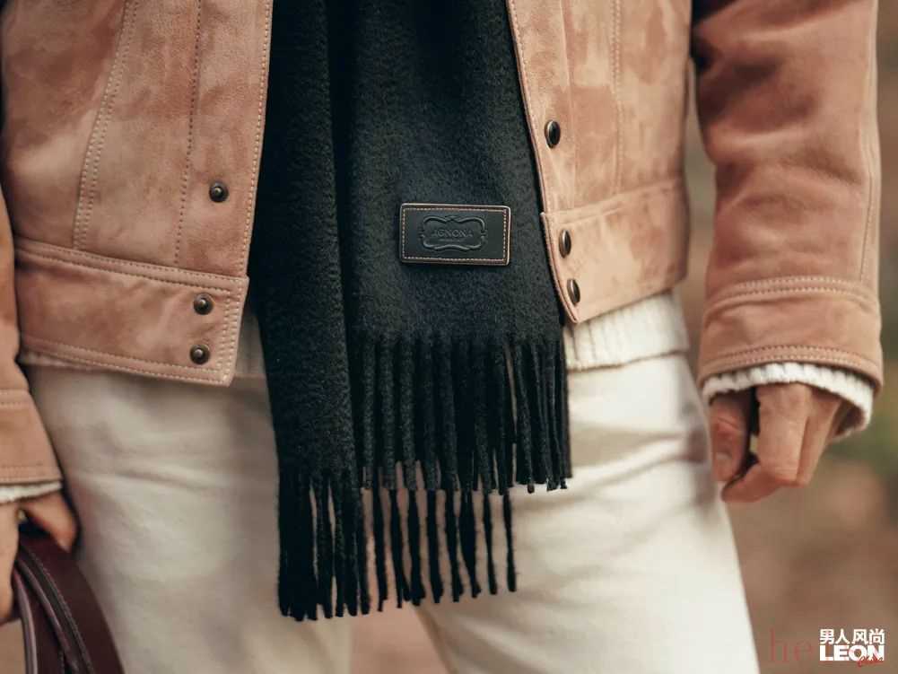 黑色羊絨圍巾,搭配顏色溫暖柔和、富于深淺變化的棕色系造型,成為絕佳點綴。 2