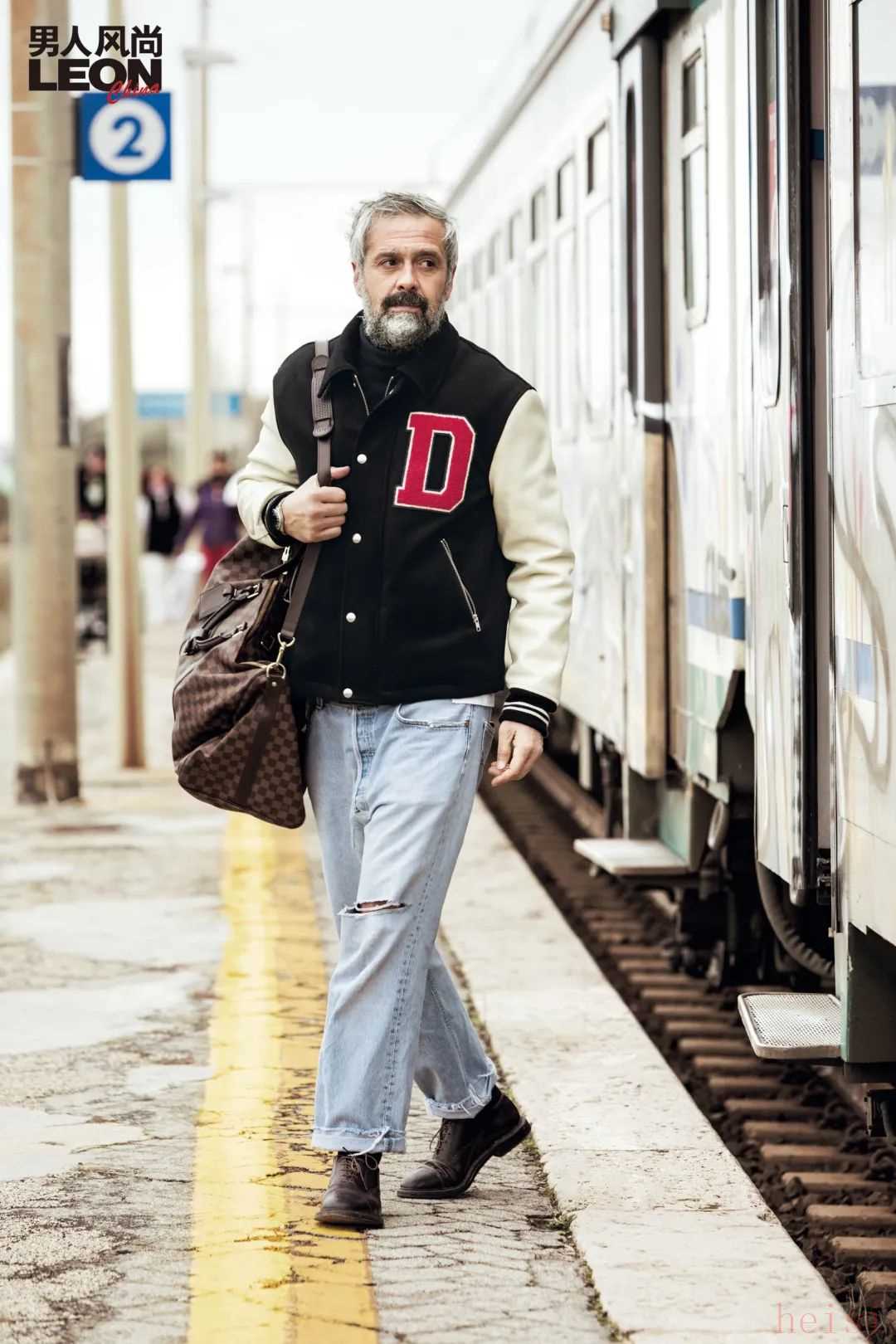 運動夾克+破洞牛仔褲。用皮鞋取代運動鞋。褲子特意選大一號,可以自己剪裁褲邊。 2