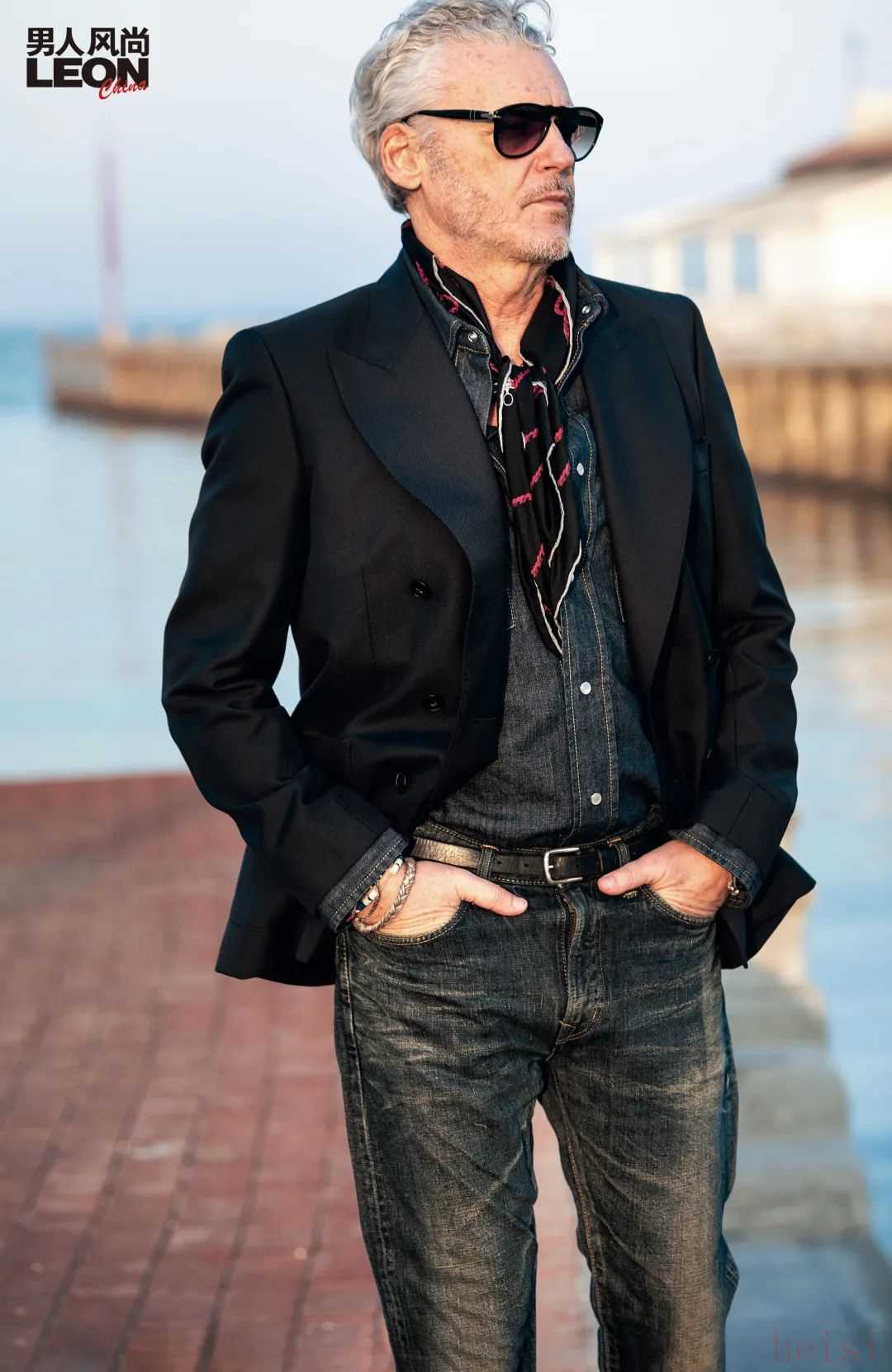 牛仔襯衫加牛仔褲,搭配夾克西裝和小方巾,是他本人獨有的華麗造型。 2