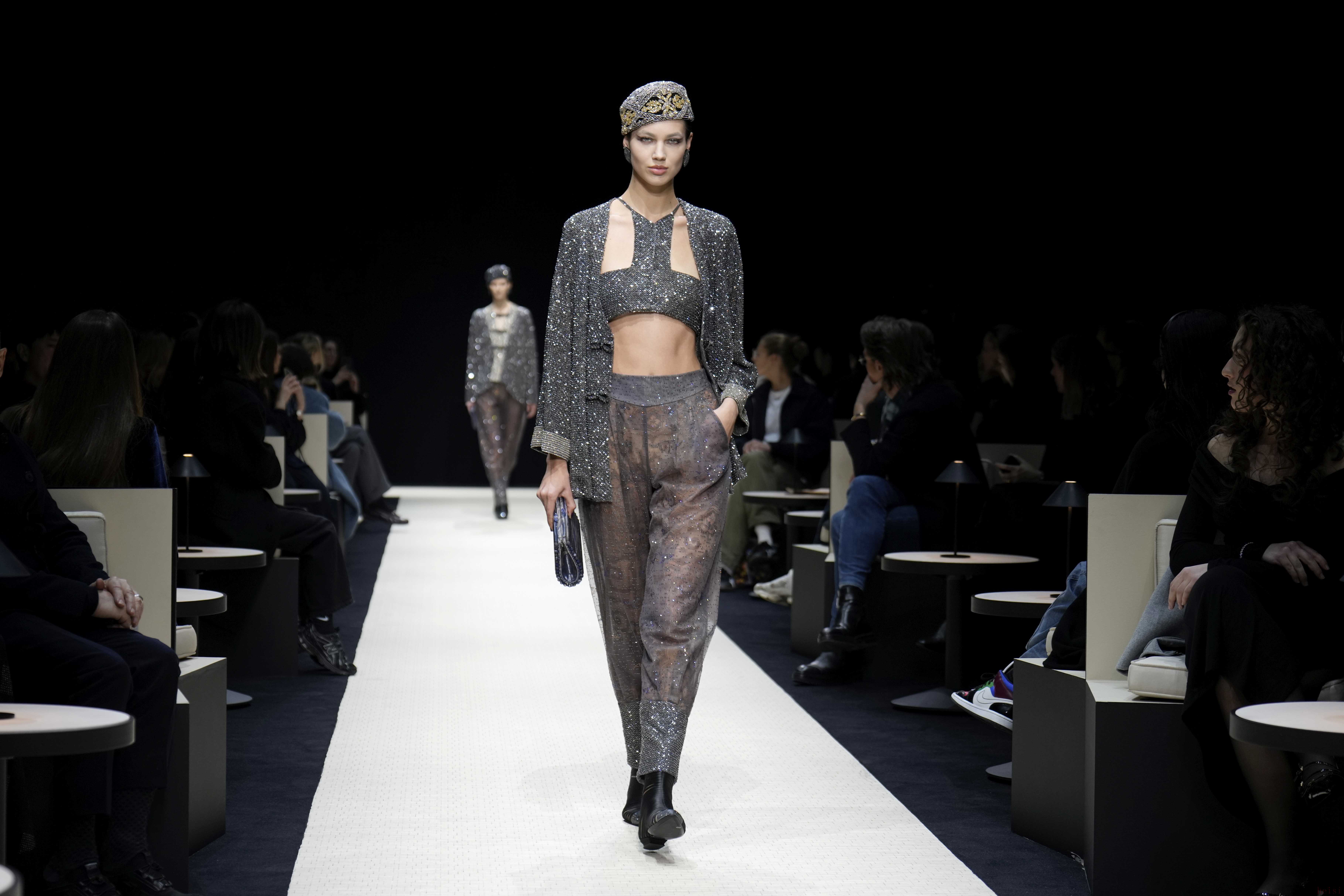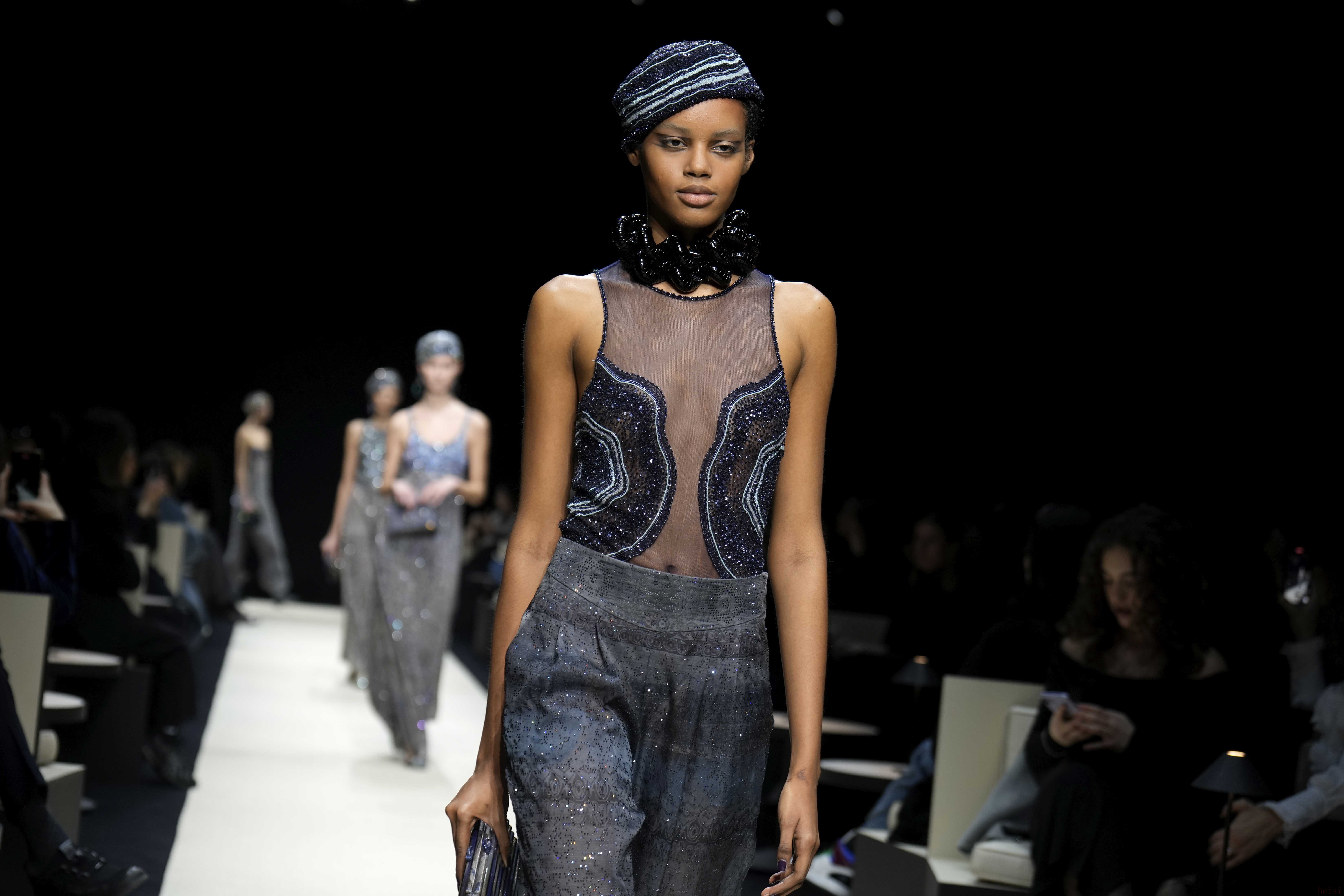 3月2日,模特在意大利米蘭時裝周上展示喬治·阿瑪尼品牌的2025/2026秋冬新款服裝。新華社/美聯(lián)
