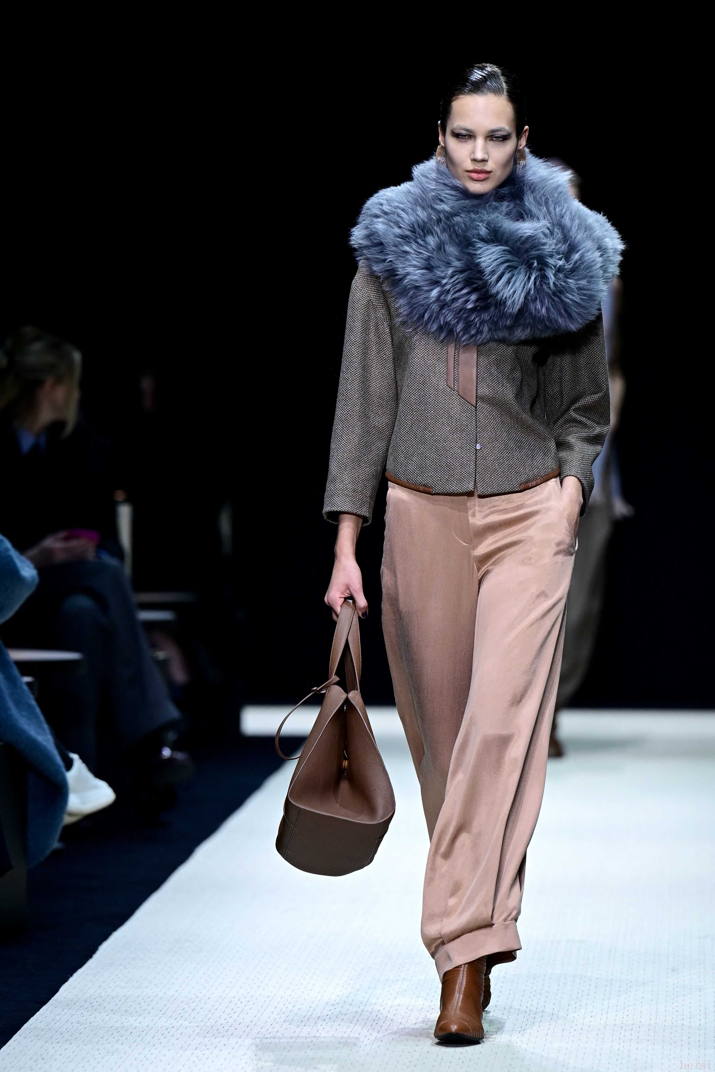 1. "色彩運(yùn)用:" 阿瑪尼以優(yōu)雅和奢華著稱,秀場上的色彩選擇通常經(jīng)典而富有層次感。可能會看到柔和的莫蘭迪色系、溫暖的土色調(diào),或是點(diǎn)綴性的亮色,整體營造出一種既現(xiàn)代又不失高級感的氛圍。