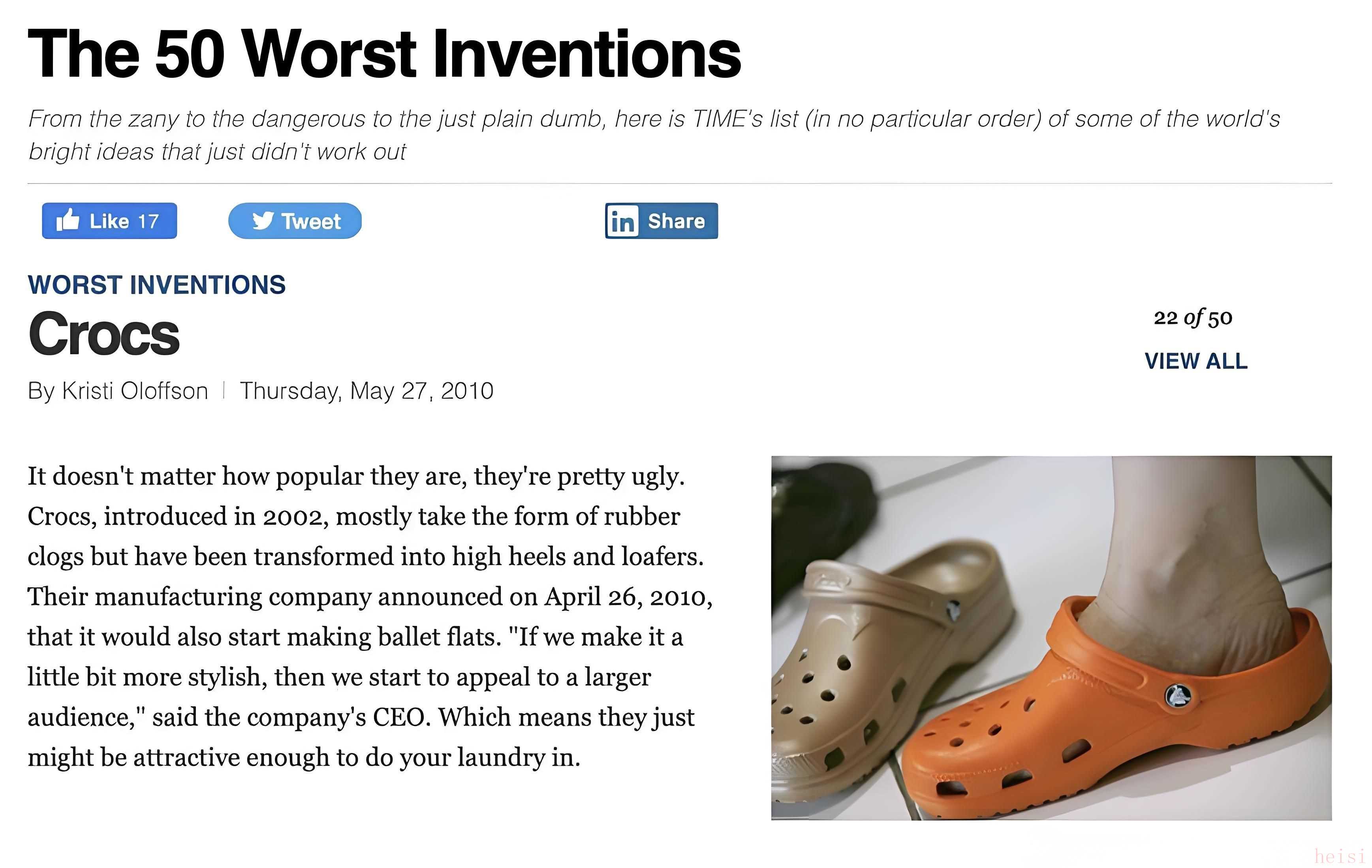 時間得撥回到2002年,三個美國老哥搗鼓出這么個玩意兒:通體塑料,鞋面上全是洞,圓頭圓腦,造型丑得那叫一個清新脫俗、獨樹一幟。