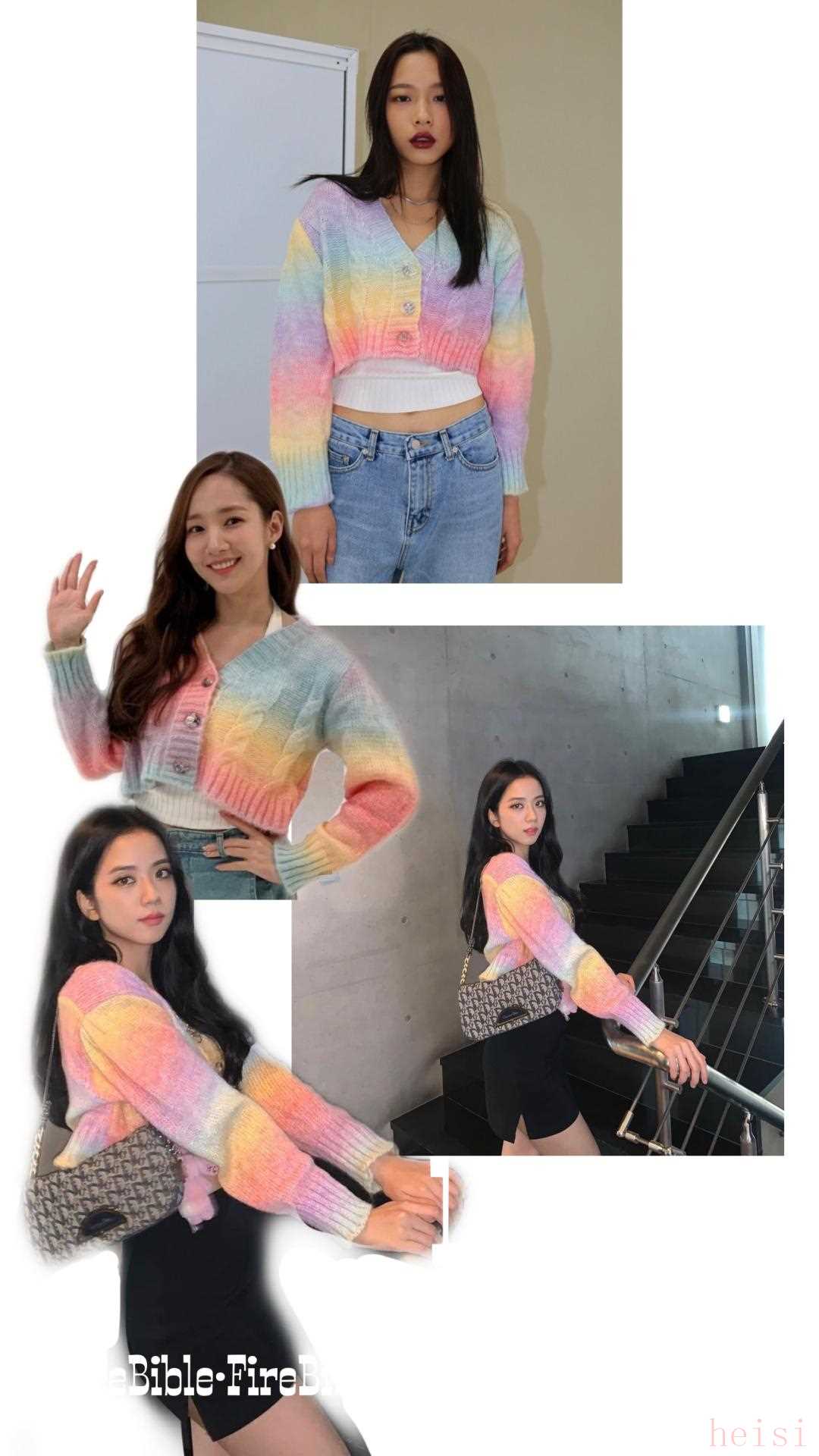 黑色寬領(lǐng)的小薄衫?水洗黑短裙,或者彩虹紗線針織罩衫?淺藍色牛仔褲,兩套溫柔搭配配上Joy甜甜的笑容,這個草小F種了。