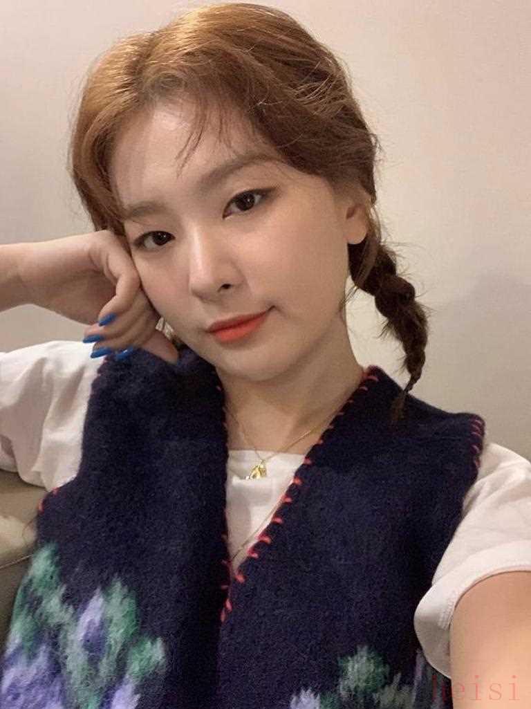 Red Velvet成員澀琪用萬能白T做內(nèi)搭,搭配相似花色的V領(lǐng)馬甲,又有別樣感覺。