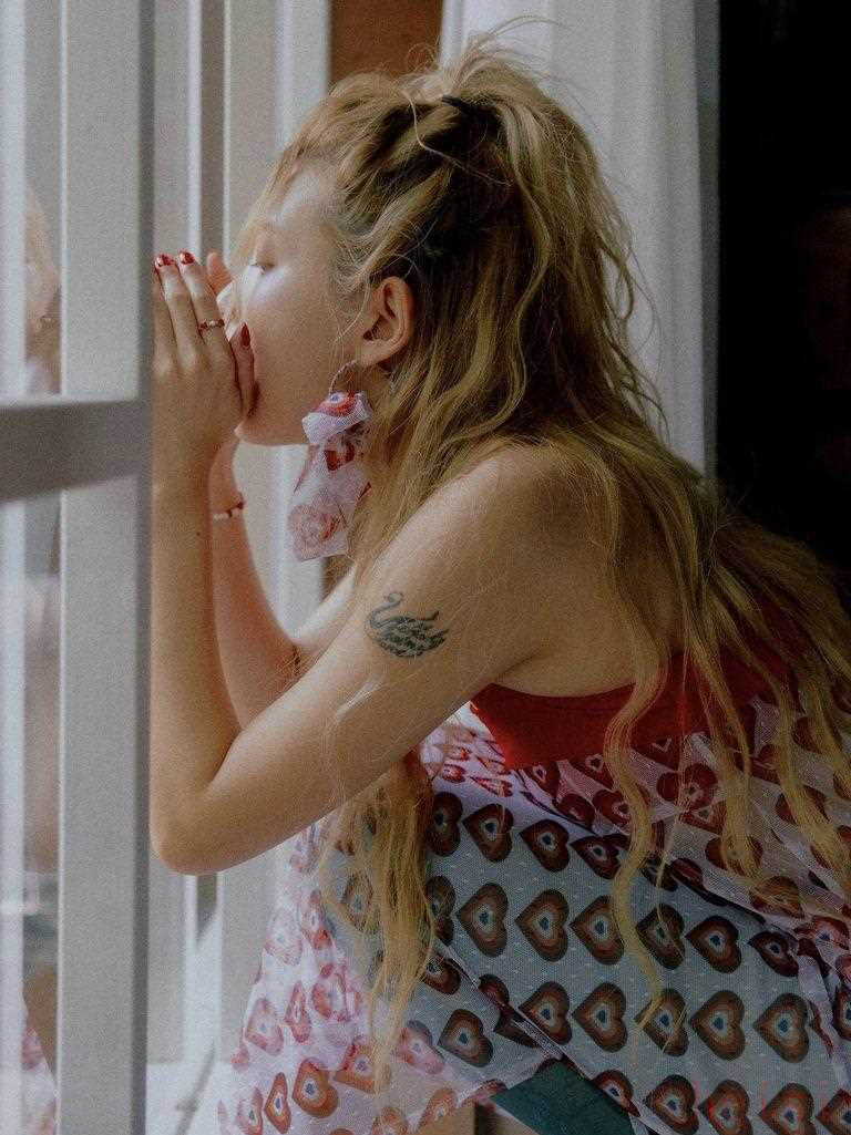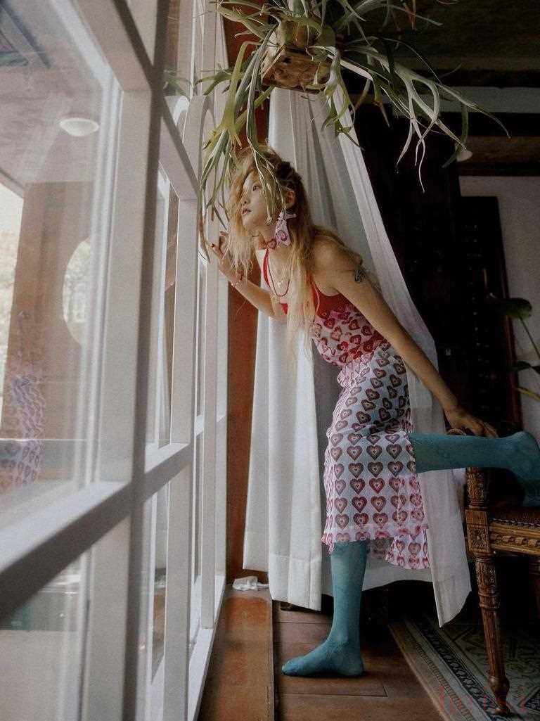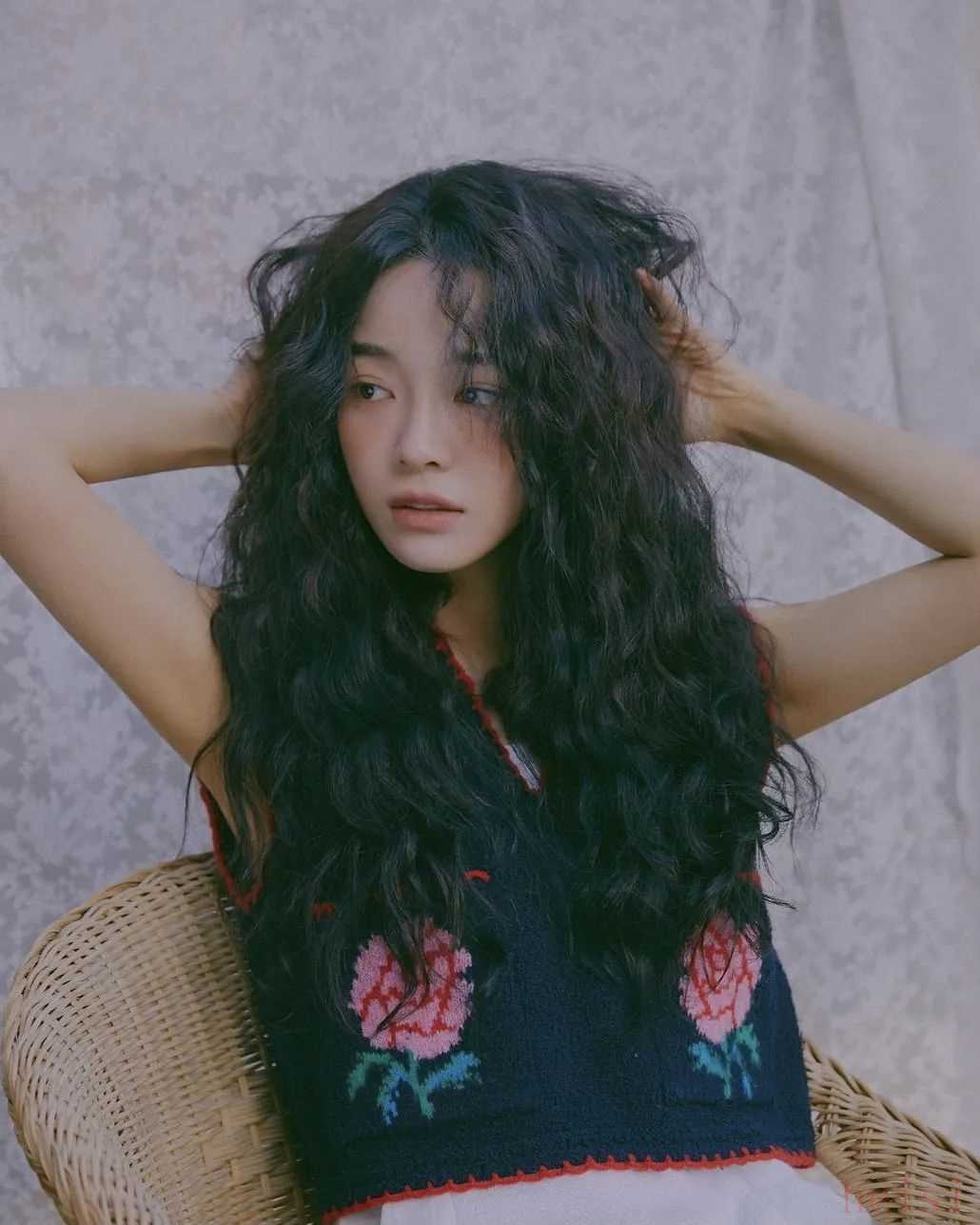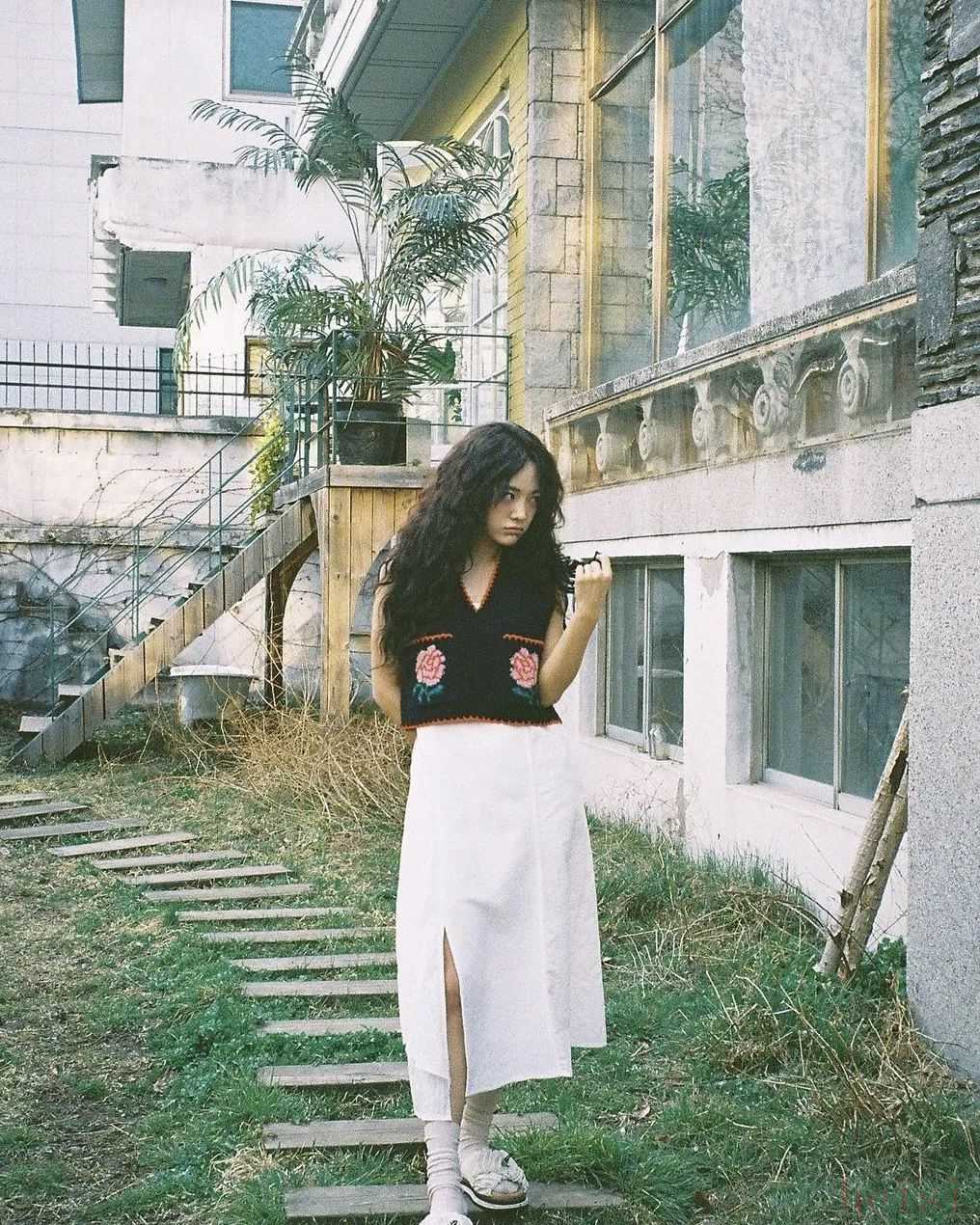 比如金世正近期拍攝的復(fù)古寫真中,她單穿EENK這件藍色繡花針織背心,搭配白色開衩半身長裙,一頭羊毛卷發(fā),營造出慵懶舒適的復(fù)古氛圍。