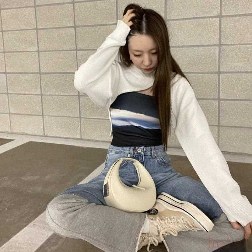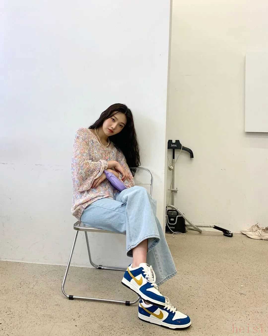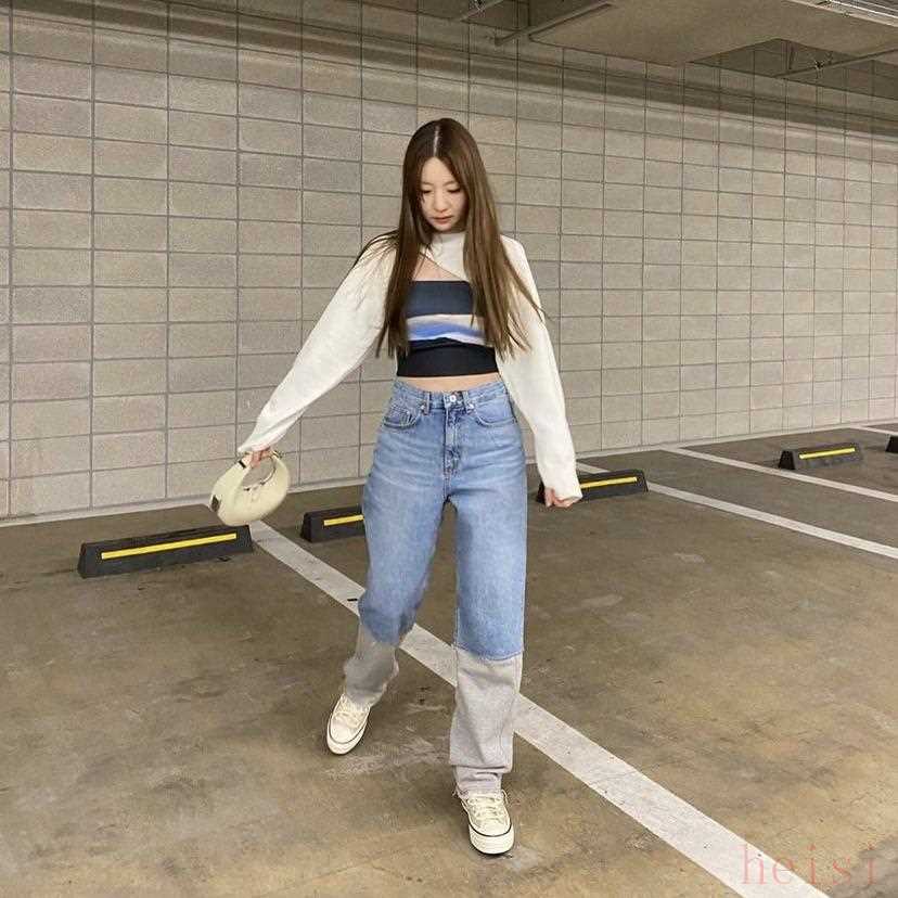 同樣一件剪裁針織衫,搭配不同花色的內(nèi)搭,風(fēng)格又不相同了。博主onnuk搭配拼接牛仔褲,藍色系穿搭更有清爽感。