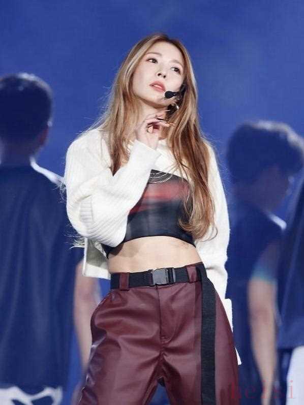 新奇的剪裁,內(nèi)搭抹胸的設(shè)計,很好地凸顯身材,非常適合舞臺。韓國國寶愛豆寶兒搭配紅棕色軍裝褲,顏色不多不少,熱烈又性感。