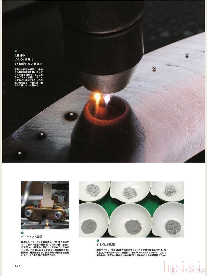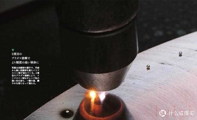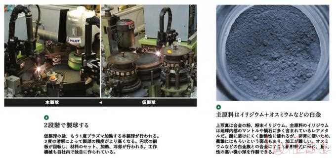 百樂的鋨銥合金銥粒的制作,大體上分為兩個階段,第一階段為粗制球珠。首先,將份量合適的鋨銥粉末,用極小的機械臂放在銅板上,具體過程如圖所示。再加上電流電壓,以能達到3000℃的熔融電解工藝,將合金粉末融化。銅板上的合金粉末,會受到表面張力影響,自然得形成球形外觀,銥粒尺寸越大,粉末需求量約多,加熱時間就越長。