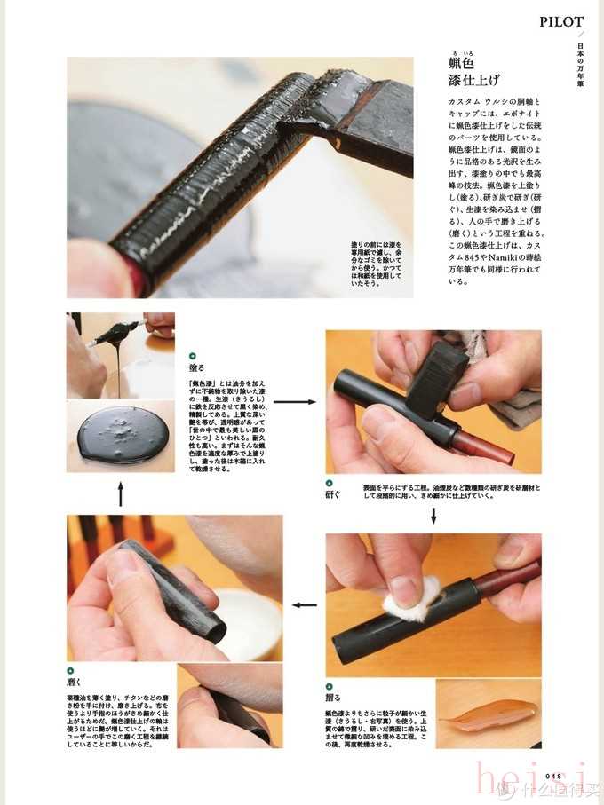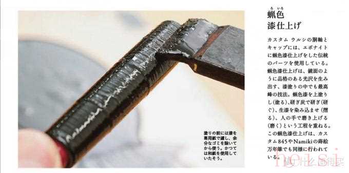 Custom Urushi的筆桿筆帽都是覆蓋蠟色漆的硬橡膠材質。蠟色漆加工可以稱得上是日本漆器技術的巔峰作品。在物件表面形成的鏡面效果,有非常強的高級感。蠟色漆的工序是首先把生漆涂在硬橡膠表面,用碳進行打磨,生漆滲入材料表面后,用人工拋光的方式達到鏡面效果,同樣的工藝工序被使用在百樂Custom 845和高端子品牌Namiki的蒔繪萬年筆上。