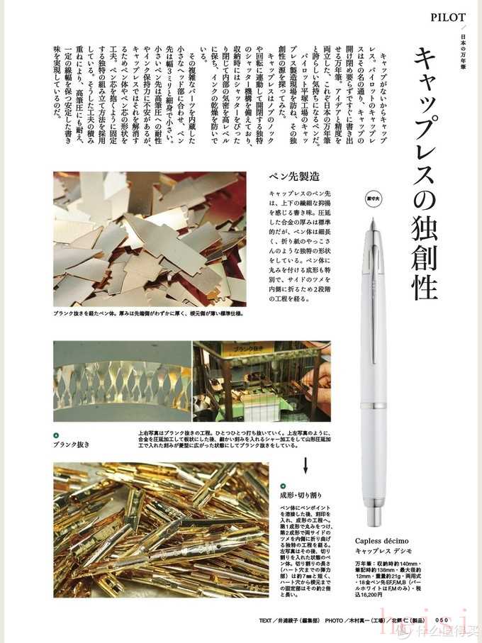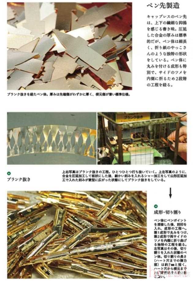 僅切割,未加工的金片如左上圖所示。Capless的書寫系統(tǒng)是相當具有表現(xiàn)力的,可以給使用者非常大的發(fā)揮空間。金片的厚度和其它百樂開放式金筆的厚度相同,但外型細長,如同一個折紙娃娃。因為細,筆尖的加工工序也相當獨特,是將兩側向內翻折,這需要二道工序來實現(xiàn)。