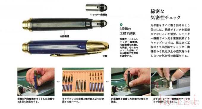 為了防止鋼筆干尖,capless系列的氣密性尤為重要。獨有的擋片體系有三層結構。百樂的工程師會依次檢測每層結構的氣密性,確保產品的品質。