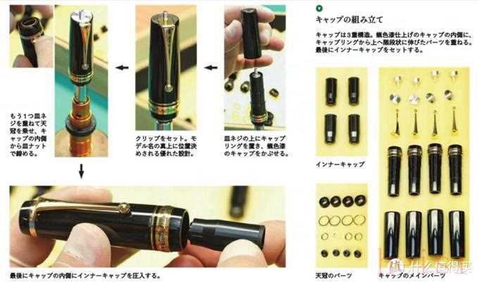 筆桿是由三重結構組成,首先將零件放入筆帽內部組裝,再把蠟色漆的筆帽添加內蓋,完成裝配。