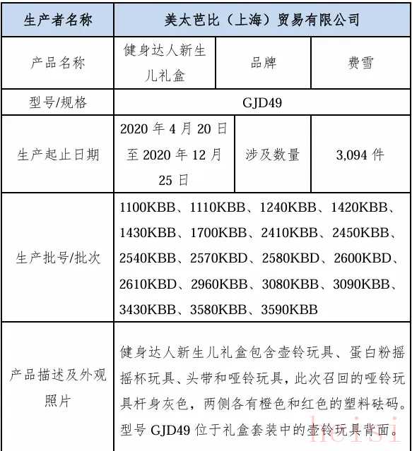 另據(jù)上海發(fā)布9月13日消息,上海市場監(jiān)管局介紹,美太芭比(上海)貿(mào)易有限公司自2024年9月13日至2025年3月12日召回2020年4月20日至2020年12月25日生產(chǎn)的費雪牌健身達人新生兒禮盒,共計3094件。