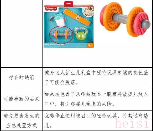 原因在于健身達人新生兒禮盒中啞鈴?fù)婢吣┒说幕疑w子可能會脫落。如果灰色蓋子從啞鈴?fù)婢呱厦撀洳⒈粙雰悍湃肟谥?,將引起嬰兒窒息的風(fēng)險。