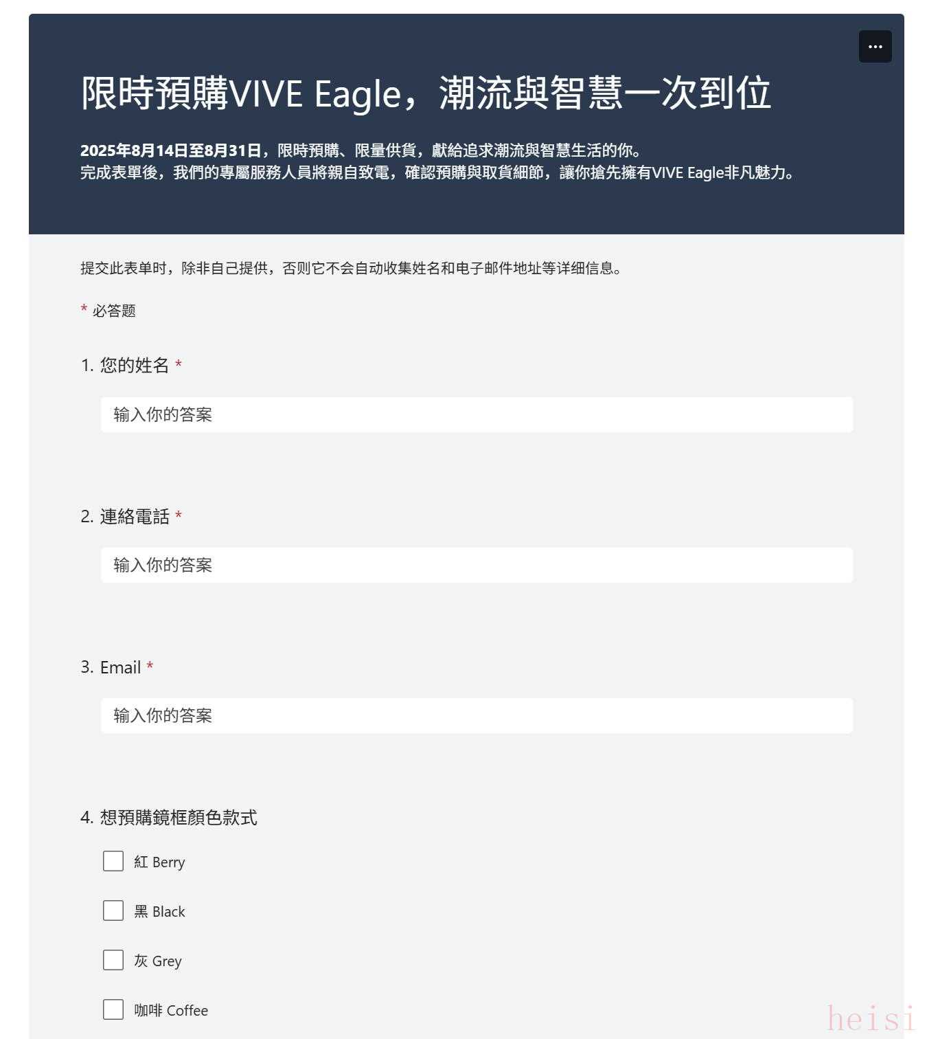 最后,關(guān)于購買信息,目前我們可以在官網(wǎng)上進行預(yù)購,根據(jù)官網(wǎng)信息,VIVE Eagle從8月14日到8月31日開啟限時、限量供貨,填表之后,會有相關(guān)人員聯(lián)系確認(rèn)取貨細(xì)節(jié),用戶還可以選擇線下門店體驗和取貨。