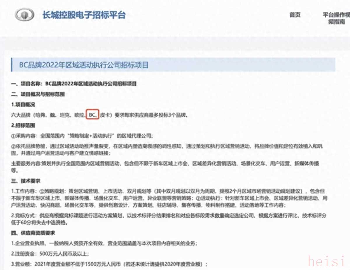 近日,在長城控股電子招標平臺上發(fā)布的《BC品牌2022年區(qū)域活動執(zhí)行公司招標項目》顯示,長城汽車將發(fā)布一個全新轎車品牌,內(nèi)部代號為BC。