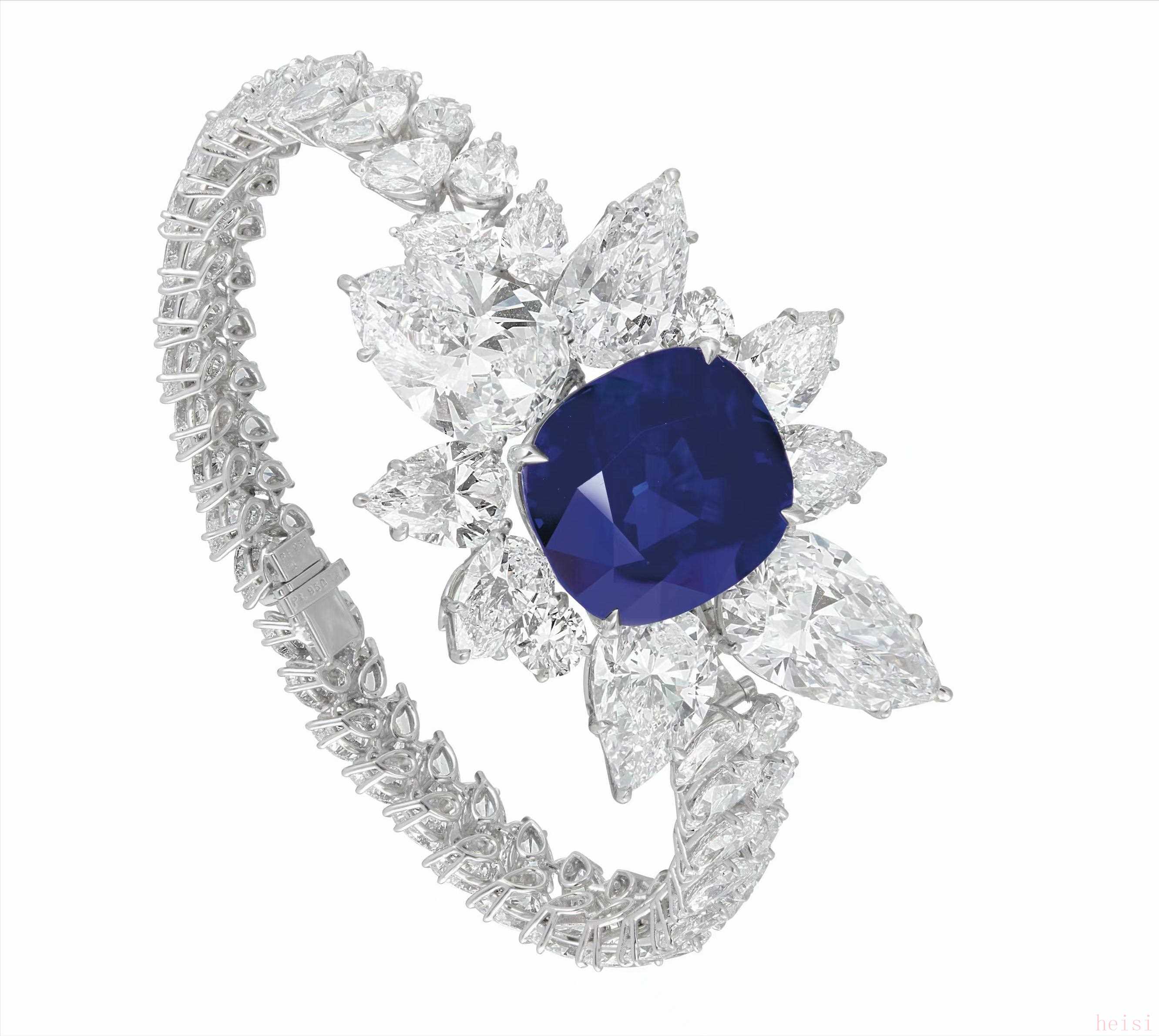 這款美麗的藍(lán)寶石和鉆石手鏈?zhǔn)谴肆斜碇凶畎嘿F的物品之一。戒指中央的 43.10 克拉“皇家藍(lán)”未經(jīng)處理的克什米爾藍(lán)色藍(lán)寶石足以吸引任何人的眼球。GIA 對(duì)鉆石和 SSEF、AGL 和古柏林的藍(lán)寶石出具的多份證書也包含在這款手鐲中。
