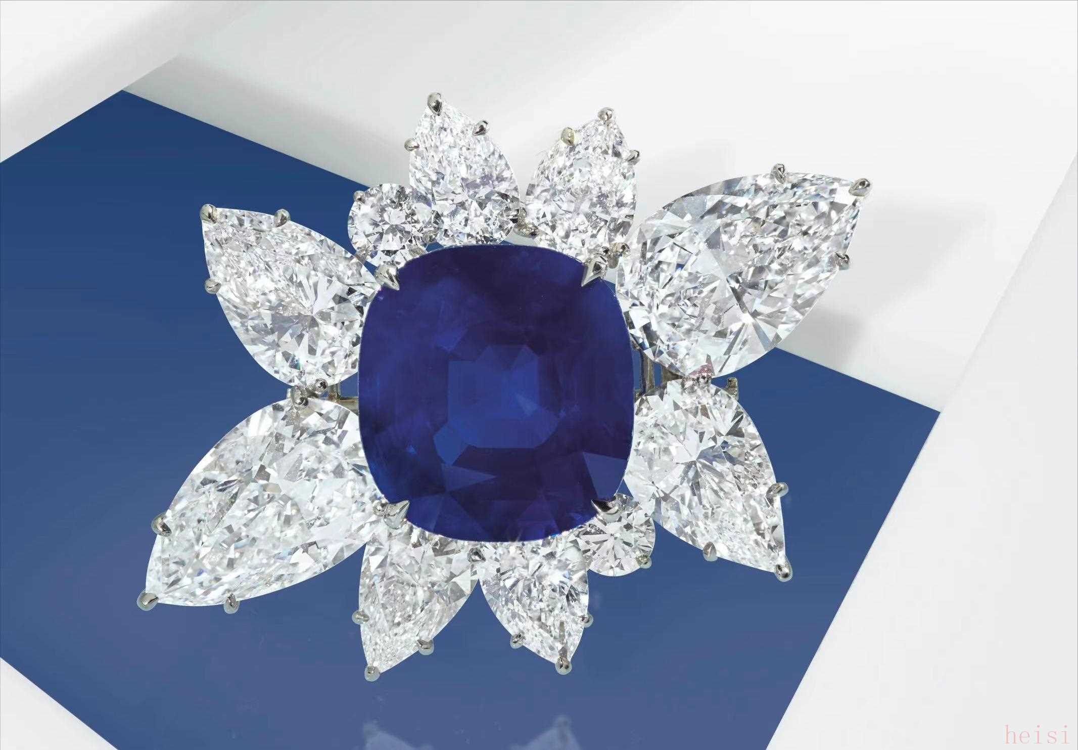 這顆 27.68 克拉的藍(lán)寶石被稱為克什米爾寶石,是非凡的,是許多收藏家追捧的寶石之一?!笆杠嚲账{(lán)”顏色歸因于這種藍(lán)寶石。這種精致寶石中柔和的紋理賦予了令人愉悅的顏色天鵝絨般的色彩,這種紋理不會(huì)強(qiáng)烈到損害寶石的透明度。