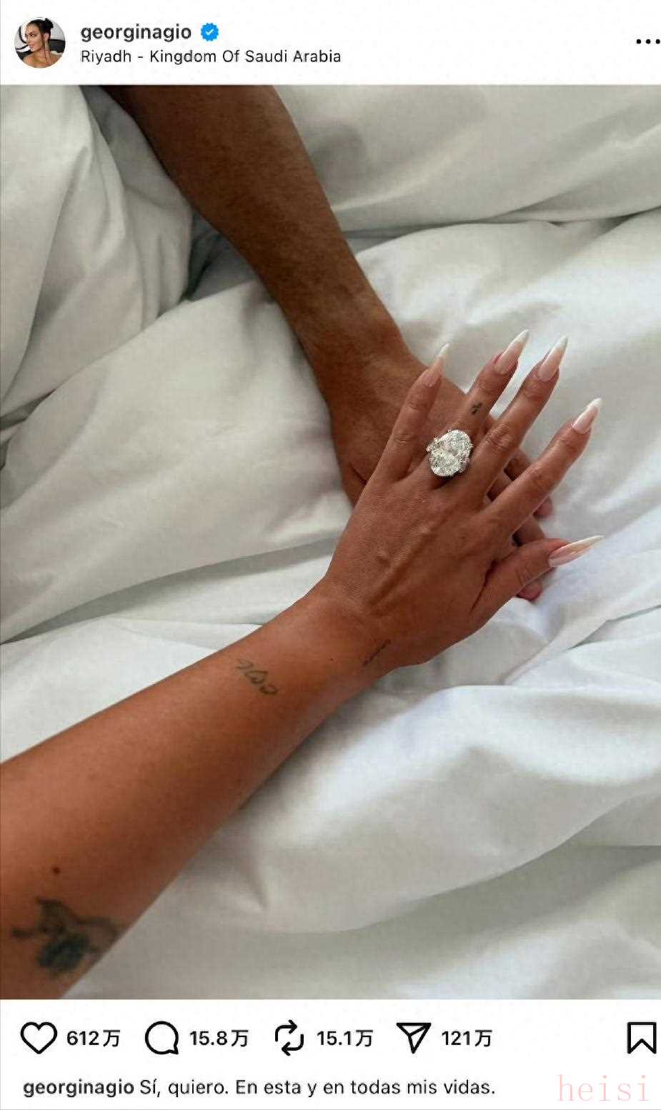 8月12日凌晨,喬治娜在Instagram曬出兩人十指緊扣的照片,左手無名指上一枚祖母綠切割巨鉆光芒奪目,配文寫道:“是的,我愿意。此生此世,生生世世。”短短1小時(shí),帖文收獲超1200萬點(diǎn)贊,球迷涌入評論區(qū)狂刷“?Felicidades!(恭喜)”。