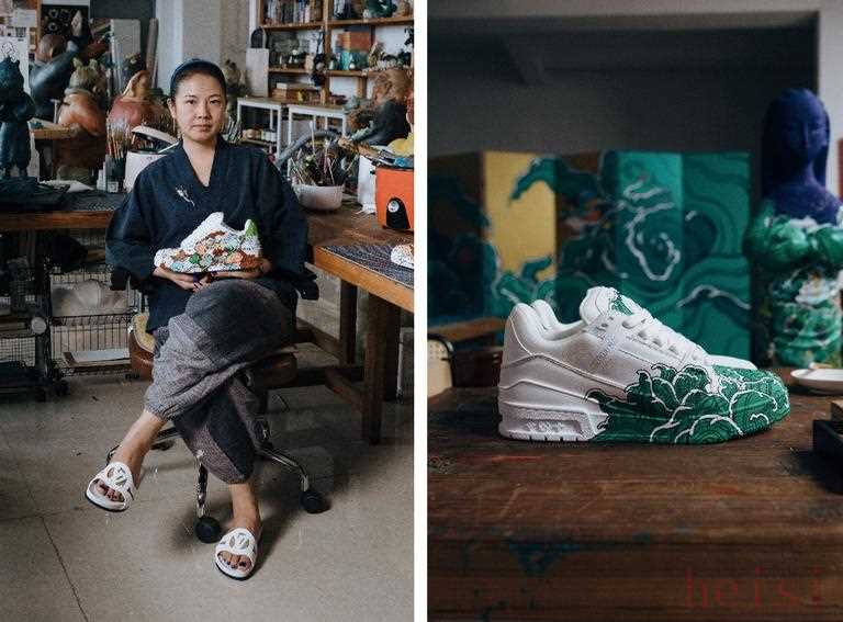 由藝術(shù)家文那全新演繹的兩款LV Trainer運(yùn)動(dòng)鞋 - “Wave”(浪之上)及“Cloud”(云之上),將海浪和祥云通過壁畫的繪制手法,栩栩再現(xiàn)于鞋面?!埃譨ve”(浪之上)靈感源于中國傳統(tǒng)意象中的綠色海浪,也是文那作品中常見的視覺符號(hào)。浪花設(shè)計(jì)讓鞋與地面在接觸時(shí)產(chǎn)生直觀的動(dòng)態(tài)感受: “浪花”分布在一只鞋的前掌與另一只鞋的后跟,在視覺上營造出奔跑的姿態(tài),仿佛一只腳尖輕踏浪花,另一只腳跟剛離開海面。 “Cloud”(云之上)則采用了品牌的經(jīng)典色系,富于繽紛色彩和生動(dòng)的小神仙圖案。在文那眼里,云帶有騰空與漂浮之感,傳遞出自然、神秘的狀態(tài),充滿悠閑自由的情緒。每一雙球鞋均由意大利制鞋工坊的工匠手工繪制完成。
