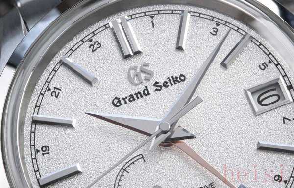 冠藍獅冬至,型號SBGE269。二十四節(jié)氣,冬至,是白晝最短、黑夜最長的一天。但冠藍獅冬至這只表,使用了白色盤面,表盤上有顆粒裝飾。描繪冬季雪天的景象。手表使用金色兩地時指針和GMT印字,意味冬季里的金色陽光。兩地時刻度,位于表盤外圈,和手表時標(biāo)交錯布局。冬至是一只spring drive機芯手表,使用9R66 spring drive自動機芯,動力72小時。