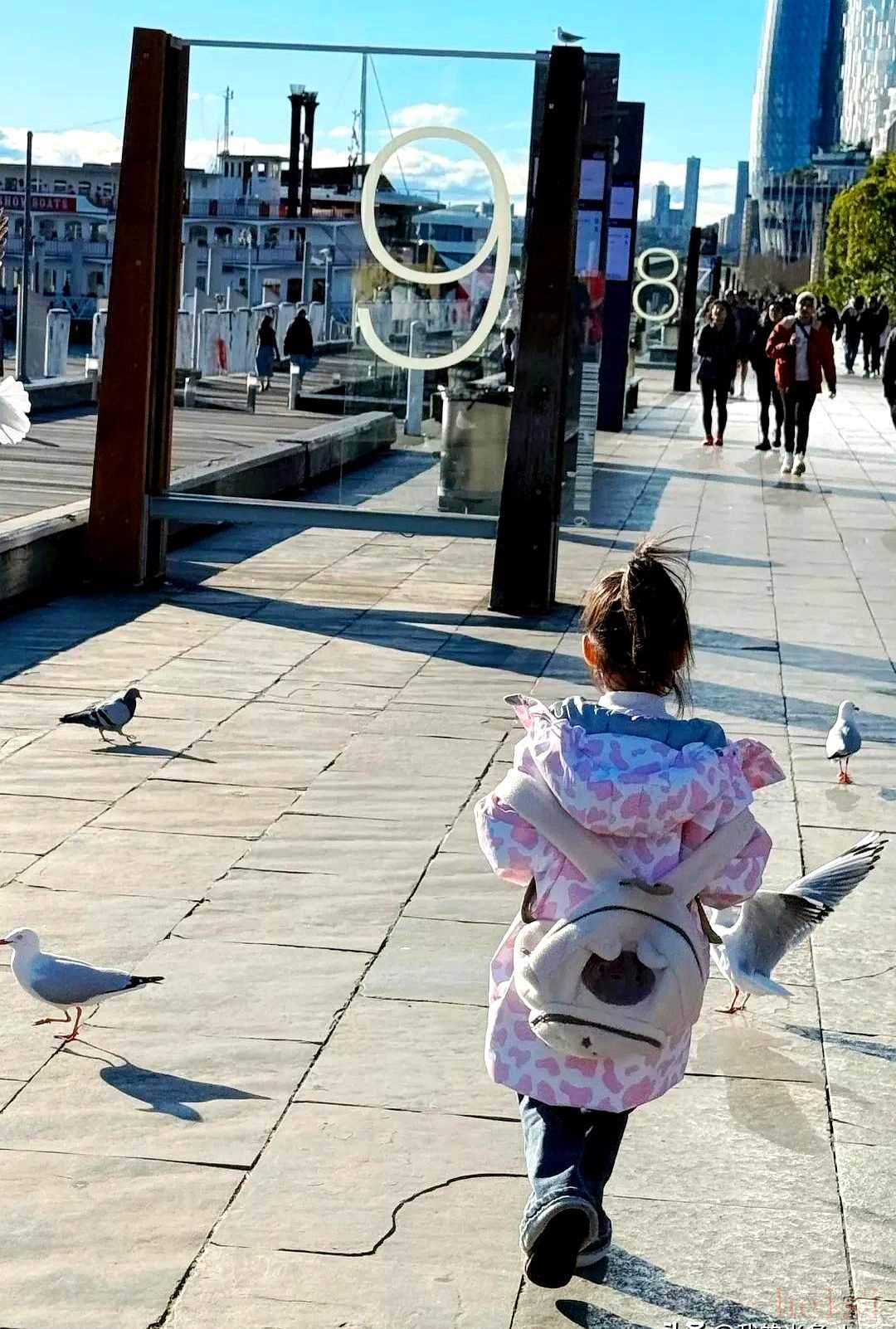 林峯背著鼓鼓的雙肩包,另一只手牽著老婆,三人走在墨爾本港口的木棧道上。