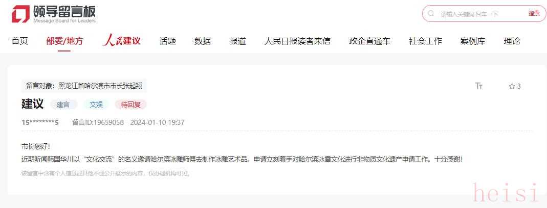 也有網(wǎng)友建議:近期聽(tīng)聞韓國(guó)華川以“文化交流”的名義哈爾濱冰雕師傅去制作冰雕藝術(shù)品。申請(qǐng)立刻著手對(duì)哈爾濱冰雪文化進(jìn)行非物質(zhì)文化遺產(chǎn)申請(qǐng)工作。目前,該建議暫未獲回復(fù)。