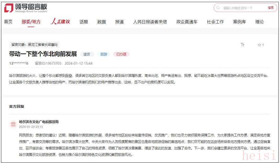 針對(duì)另一則“以哈爾濱旅游帶動(dòng)?xùn)|北發(fā)展”的建議,哈爾濱市文化廣電和旅游局于1月23日回復(fù)道: