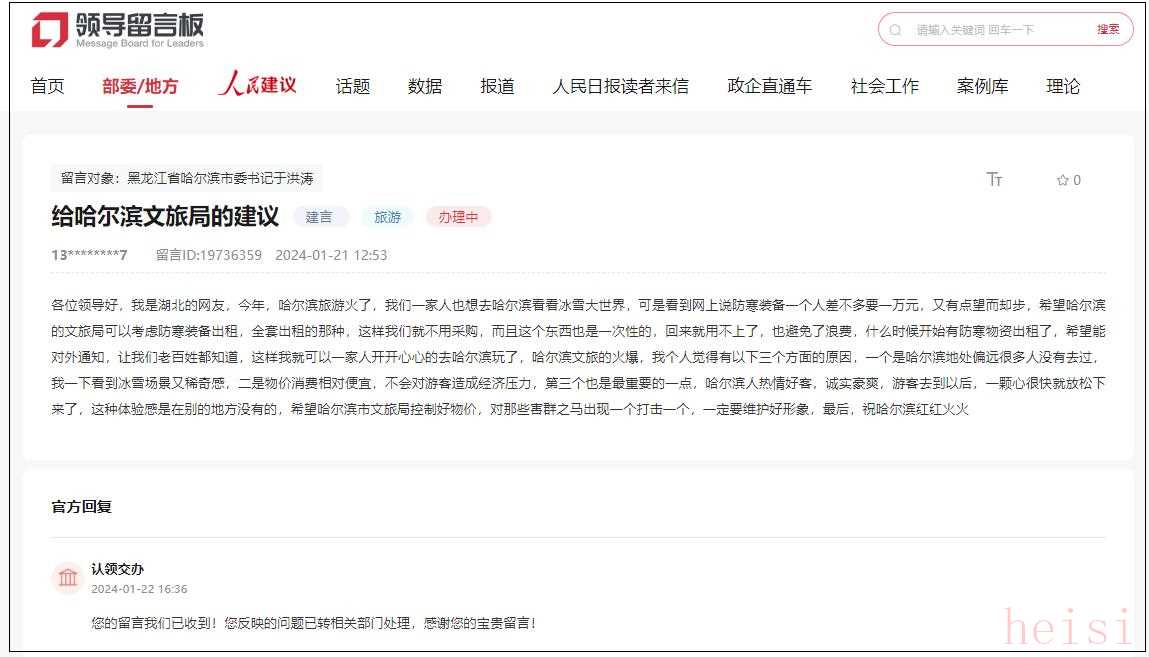 哈爾濱市信訪局1月24日對(duì)此回復(fù)稱(chēng),這條建議“十分切合我市實(shí)際又精辟獨(dú)到,我們將認(rèn)真學(xué)習(xí)吸納,將之融入下步推進(jìn)工作中”。