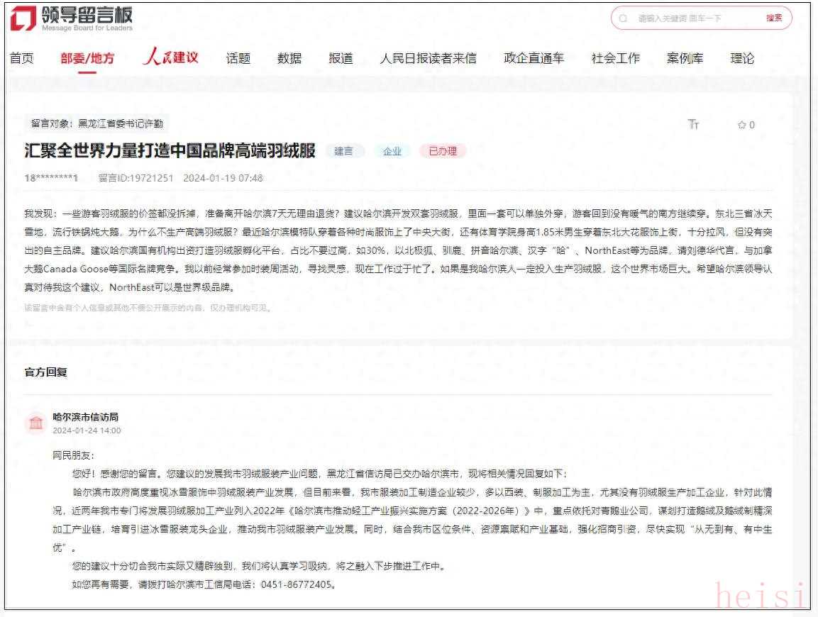 其中,一名網(wǎng)友于1月19日留言認(rèn)為,許多游客前來(lái)旅游,羽絨服需求很大,建議哈爾濱生產(chǎn)高端羽絨服,開(kāi)發(fā)“NorthEast”等品牌。