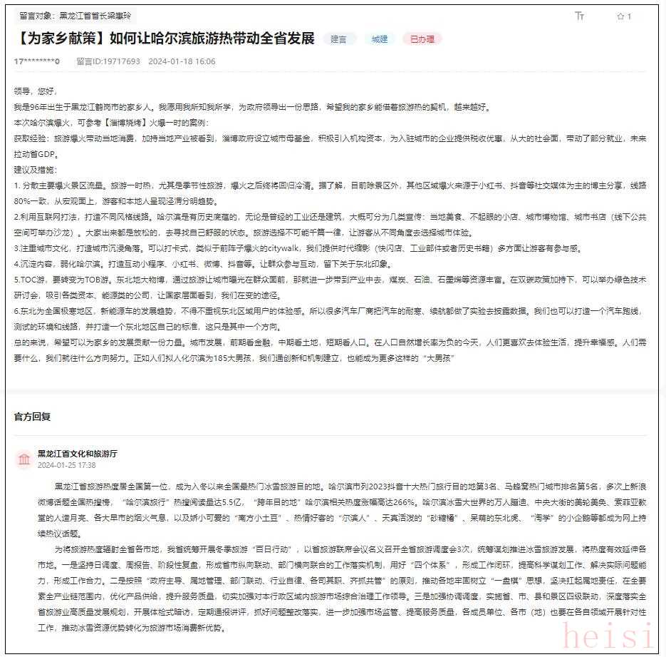 1月25日,黑龍江省文化和旅游廳回復(fù)稱(chēng):