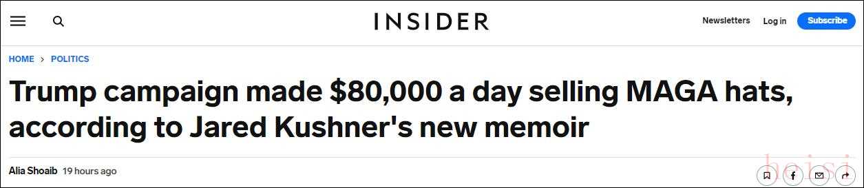 據(jù)美國“商業(yè)內(nèi)幕”網(wǎng)站30日報道,特朗普女婿庫什納在即將出版的回憶錄中透露,這個由特朗普親自設(shè)計的帽子,一度為特朗普2016年的競選活動帶來了每天8萬美元(約合人民幣53.95萬元)的收入,他們最終賣出的帽子甚至足夠支付競選活動的大部分間接成本。