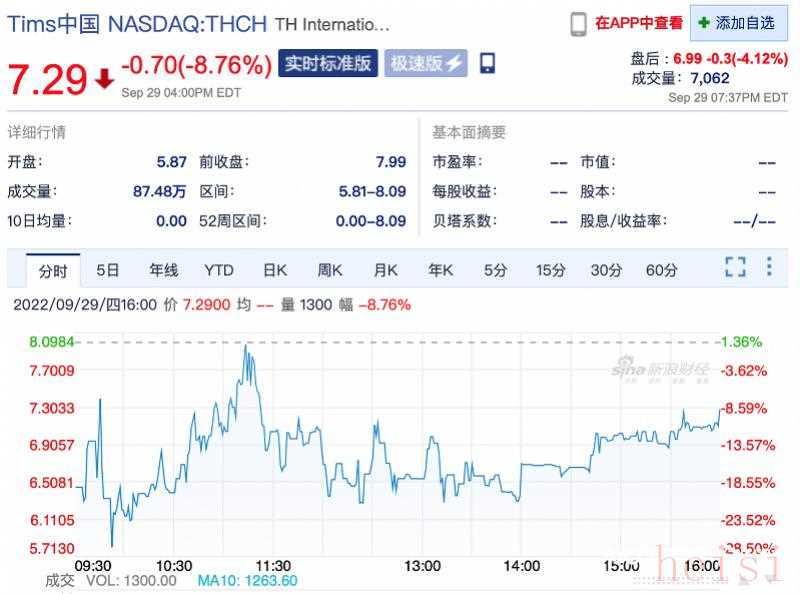 北京時(shí)間9月29日21:30,加拿大咖啡品牌Tims中國(guó)(THCH.NASDAQ)正式登陸納斯達(dá)克上市,開(kāi)盤(pán)價(jià)5.87美元,盤(pán)中最低觸達(dá)5.81美元,最高觸達(dá)8.09美元,收盤(pán)價(jià)7.29美元,首日下跌8.76%,市值12.06億美元。
