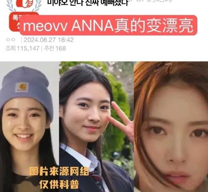 但比起網(wǎng)友的各種質(zhì)疑,Anna所在組合MEOVV的存在感更值得拿出來說說。至今MEOVV已經(jīng)出道快一年了,但除了回歸之外,整個(gè)組合在空白期仿佛人間蒸發(fā),Anna的“六顏一”是純靠自己的顏值推出來的,如果不是這個(gè)話題,Anna在kpop真的“查無此人”。