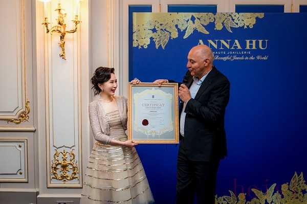 法國高定公會(Fe?de?ration de la Haute Couture et de la Mode)執(zhí)行主席 Pascal Morand給ANNA HU頒發(fā)法國高定公會受邀會員證書