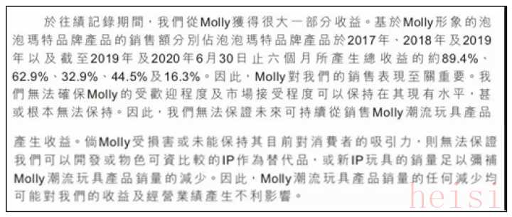 “盲盒模式極其容易復(fù)制,塑料小玩具,哪里難得倒我們中國制造?初看是低壁壘行業(yè),但再仔細(xì)想想,這門生意是否一直維持較高的盈利能力,關(guān)鍵是優(yōu)秀的IP?!币晃粌r(jià)值投資者認(rèn)為。他解釋,打造IP可不容易,需要?jiǎng)?chuàng)作者花費(fèi)大量時(shí)間、精力與資本,能獲得消費(fèi)者的情感認(rèn)同,才能助推周邊銷售。國外的優(yōu)秀IP,比如迪士尼、漫威、柯南等,都已經(jīng)非常成熟。Molly當(dāng)然已經(jīng)是盲盒領(lǐng)域比較知名的IP,但和上述這些IP相比,它的生命周期、用戶黏性顯然是遠(yuǎn)遠(yuǎn)不足的。在招股說明書40頁的“風(fēng)險(xiǎn)因素”中,泡泡瑪特也著重提到了,“Molly在以往業(yè)績中占了很大一部分收益,倘Molly受損害或未能保持其目前對消費(fèi)者的吸引力,公司無法保證可以開發(fā)與之比較的IP作為替代品?!边@意味著,一旦消費(fèi)者移情,泡泡瑪特的業(yè)績很容易“回到解放前”。