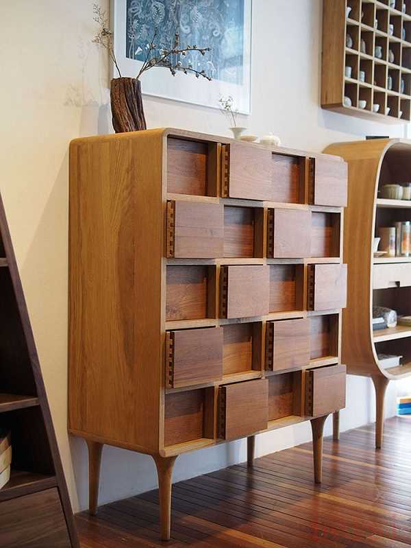 很多人比較喜歡的多格柜,我覺著真正的設(shè)計師是我們的家具廠廠長時師傅,那時候我畫了一個多格柜的圖,要 20 個抽屜,那就是 20 個拉手,感覺很繁瑣,又不美觀,時師傅他說有個傳統(tǒng)工藝「牛角拐」,可以解決,沒有拉手也可以打開,于是大家商量了一下就開始做了,第一款做出來的時候他興奮的給我打電話,說「可好看了」。他是熱愛家具這行業(yè)的,我們合作起來都很開心。