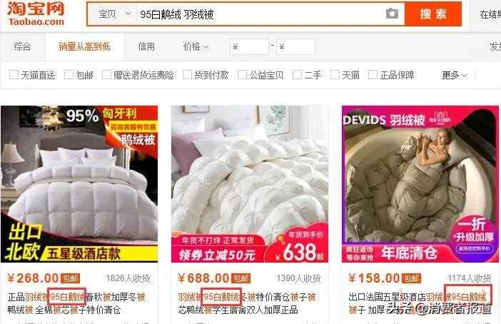 ▲某電商平臺關(guān)于”95白鵝絨 羽絨被”的搜索結(jié)果