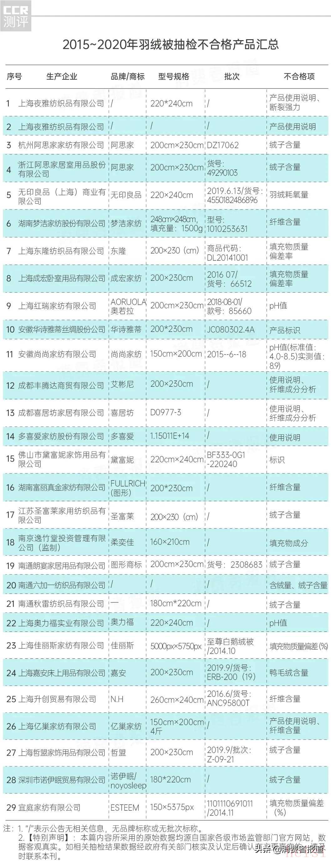 結(jié)果顯示,2015年至2020年間,國家、省級監(jiān)管部門共抽檢發(fā)現(xiàn)29批次羽絨被不合格,其中絨子含量、使用說明、填充物質(zhì)量偏差、纖維含量等指標不合格問題較突出,阿思家、無印良品、夢潔家紡、東隆等品牌上黑榜。