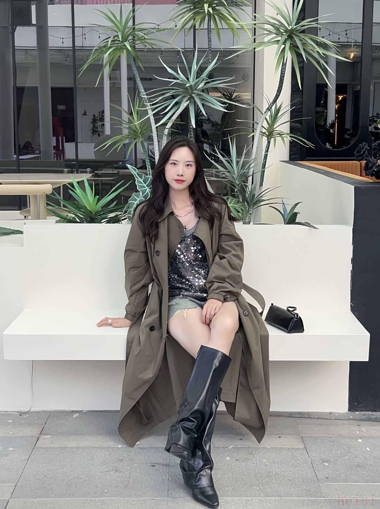 亮片上衣搭配長(zhǎng)款風(fēng)衣,在秋季是最流行、最不會(huì)出錯(cuò)的存在。MO&Co.這件超長(zhǎng)款風(fēng)衣有一種中性的帥氣感,配上黑色高筒靴,是酷颯姐姐沒錯(cuò)了!