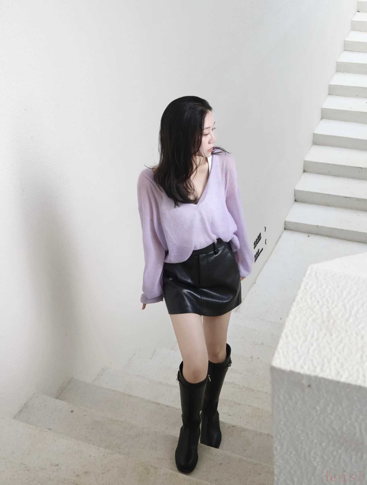 莫蘭迪紫色V領(lǐng)針織衫寬松且舒適,搭配黑色皮質(zhì)短裙,時(shí)尚與質(zhì)感的完美結(jié)合。