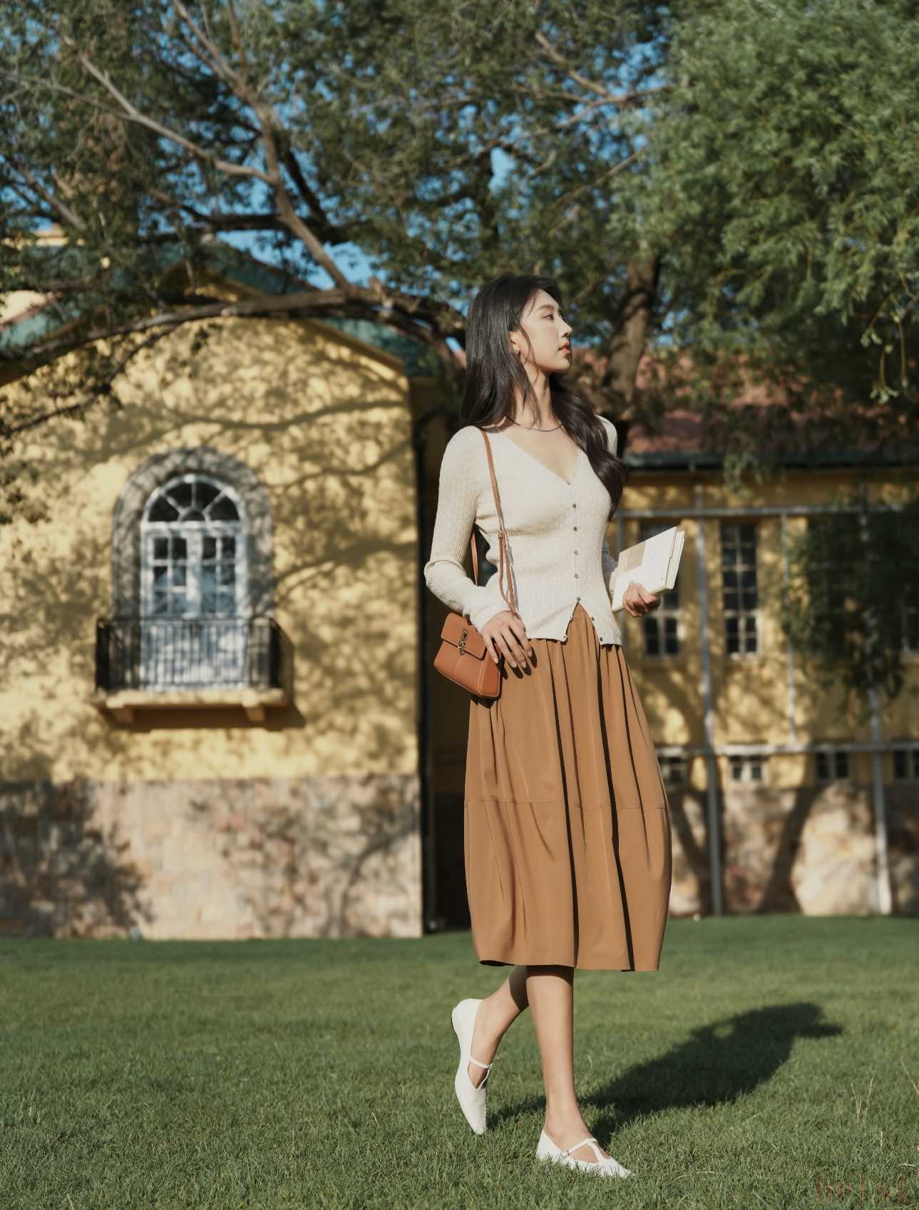 如果要用一件單品來形容溫柔,那非針織衫莫屬,針織衫自帶早秋慵懶氛圍,小V領(lǐng)的針織開衫配上棕色半身長(zhǎng)裙,要想更加氣質(zhì)那必選平底單鞋,一整個(gè)溫柔住了!