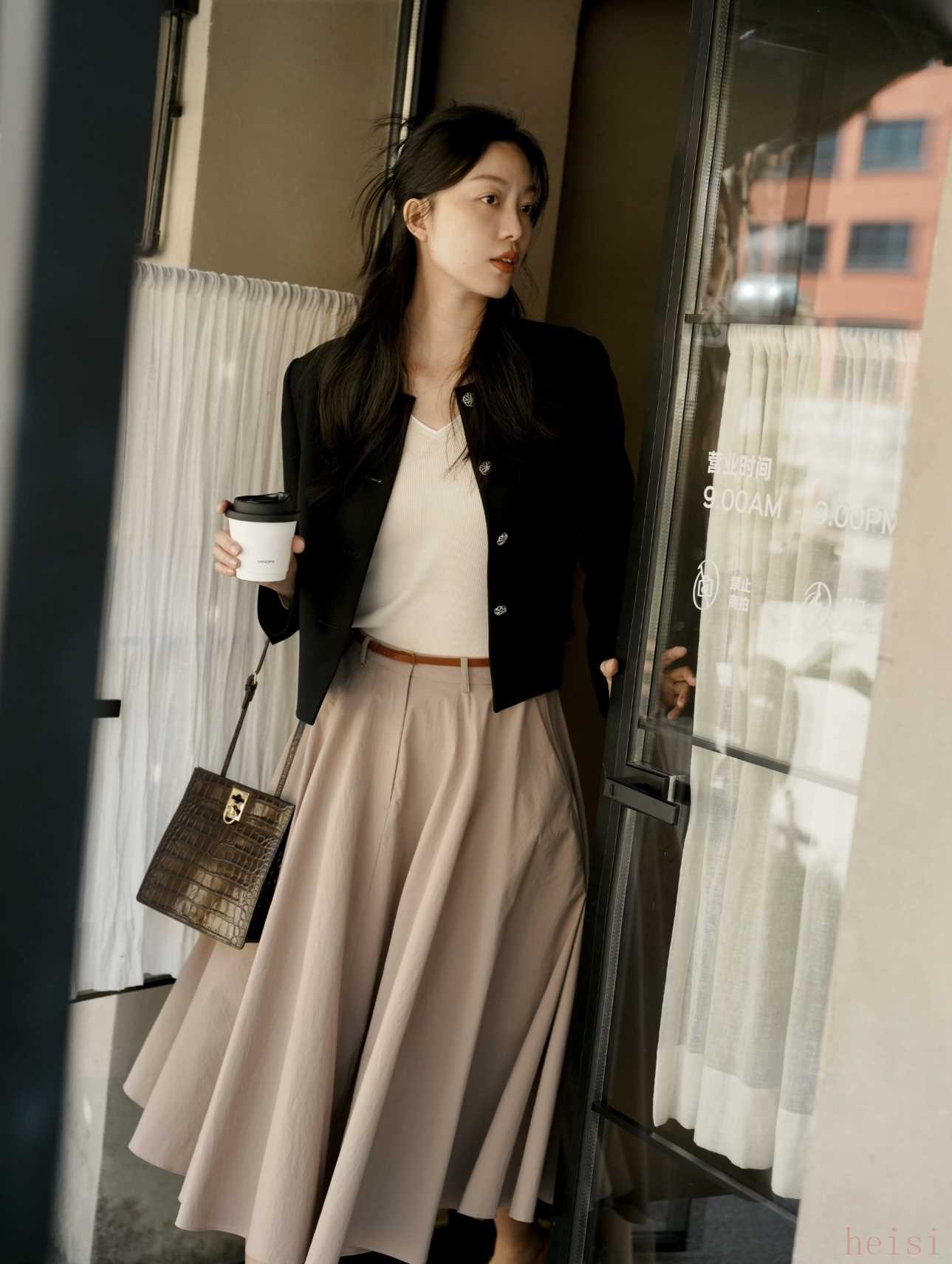 “姐系”穿搭在色彩上會(huì)有很嚴(yán)格的把控,一般全身不會(huì)超過三個(gè)顏色,白色打底衫+黑色外套+卡其色半身傘裙,都是基礎(chǔ)色和基礎(chǔ)款,但搭配在一起盡顯優(yōu)雅氣質(zhì)。