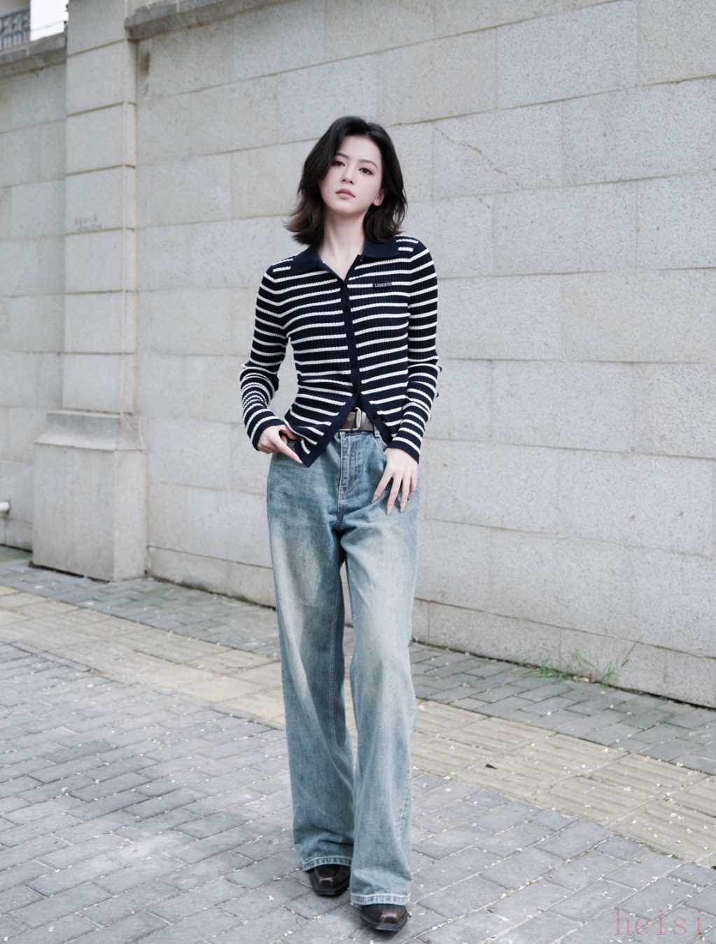 黑白條紋針織上衣,配上做舊款牛仔褲,不經(jīng)意之間的松弛才更加吸引人眼球,看似沒有精心搭配,實(shí)則兩件單品的組合說很難出錯(cuò)的選擇。輕松拿捏“姐系”穿搭。