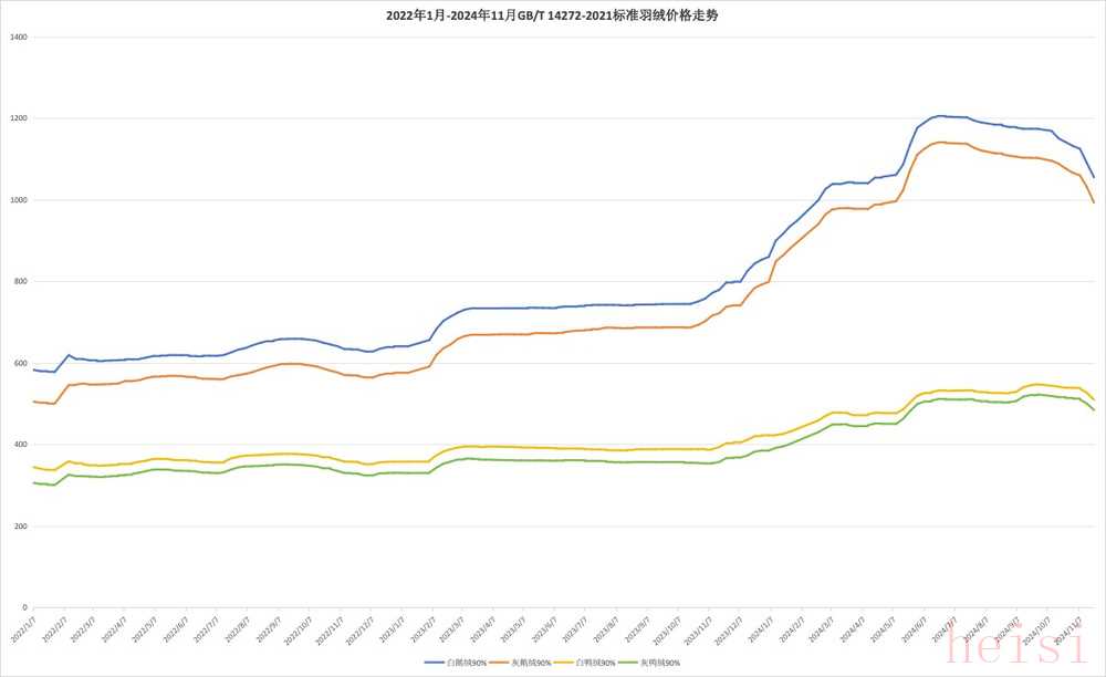 中國羽絨信息網披露的數據顯示,2022年至今包括白鵝絨、灰鵝絨、白鴨絨、灰鴨絨在內的羽絨價格均出現上漲,今年以來的漲幅已超20%。其中,90%白鵝絨從2022年1月的582.72元/千克漲到今年6月的1205.12元/千克,漲幅達到106.8%。截至11月22日,90%白鵝絨的價格下調至1054.73元/千克,但依然保持在高位運行。