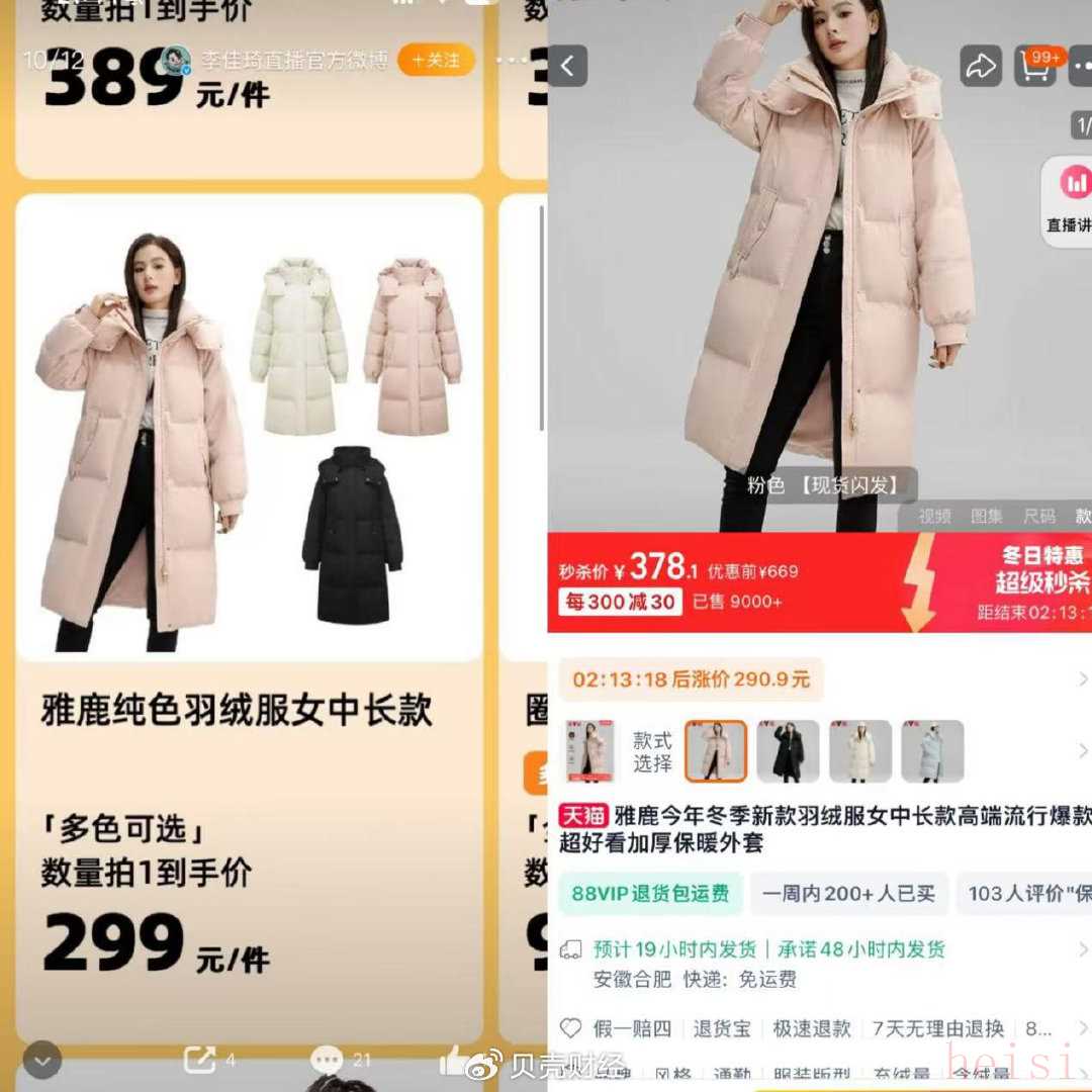 貝殼財經記者注意到,李佳琦今年7月初的一場“反季專場”中,波司登一件短款鴨絨羽絨服售價599元,如今波司登官網優(yōu)惠售賣價為639元;雅鹿一件女士中長款鴨絨羽絨服7月初的直播間價格為299元/件,相比之下,官方優(yōu)惠價為379.05元/件。在不考慮其他因素之下,漲幅分別為6.68%和26.77%。